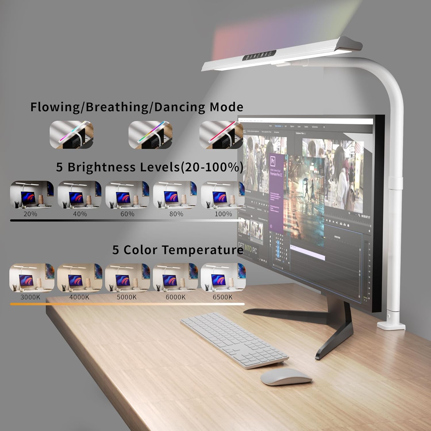 - 【Versatile Front Light Options】The clamp lamp has 150pcs LED beads, with 5 steps dimming function key that makes 23.65" transverse light bar provide decent brightness (20%-100%) and color options (3000K- 6500K).60 Mins timer setting will remind you to have a rest after working or studying attentively.The memory function memorizes your last setting.