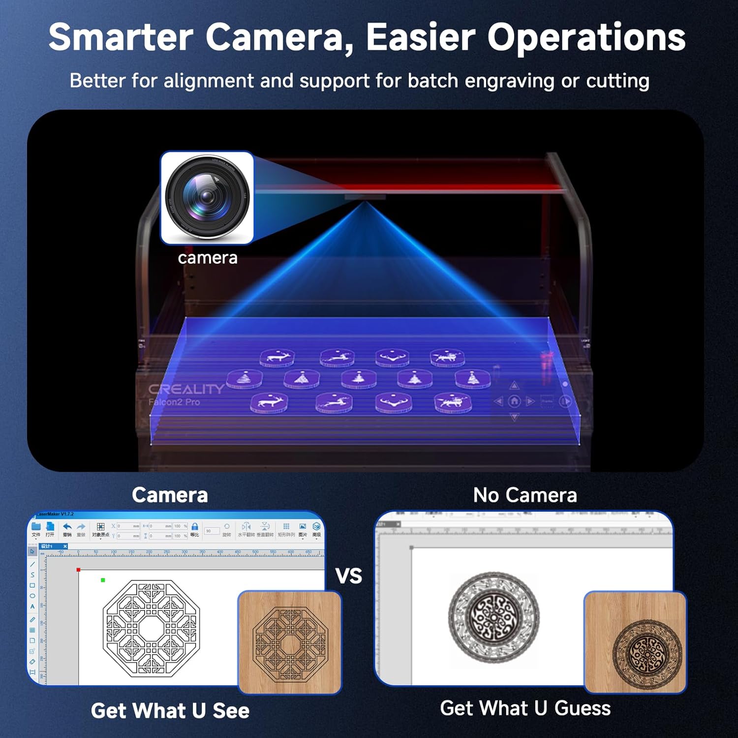 - 【New Camera Positioning】Falcon2 Pro series engraving machine new camera positioning function, you need to connect to the computer, follow the installation steps to set up the parameters related to the camera, you can call up the camera on the software to use (only connect to the computer to use). The camera function can provide better pattern positioning, and more games are expected to be unlocked by the enthusiasts.