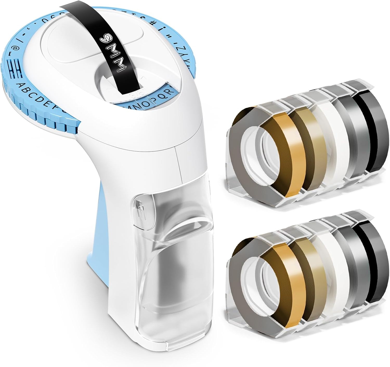 - Package Contents:It will come with a blue embossing label maker and 10 embossing label tapes (2 * champagne gold // 2 * gold / 2 * clear / 2 * silver / 2 * black embossing tape) 48 characters available for continuous use