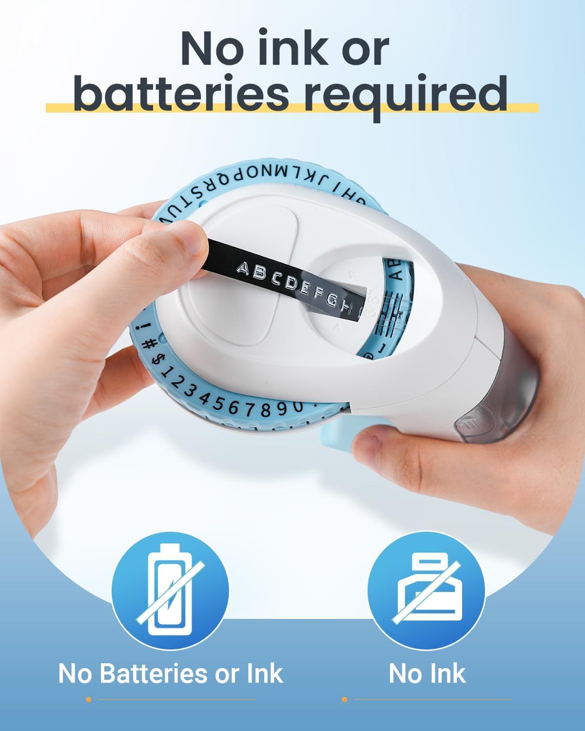 - Out of the box:this embossing label printer doesn't need to be connected to your phone or computer, and works on its own without power or ink, just turn the dial to select letters, numbers or symbols and squeeze the handle