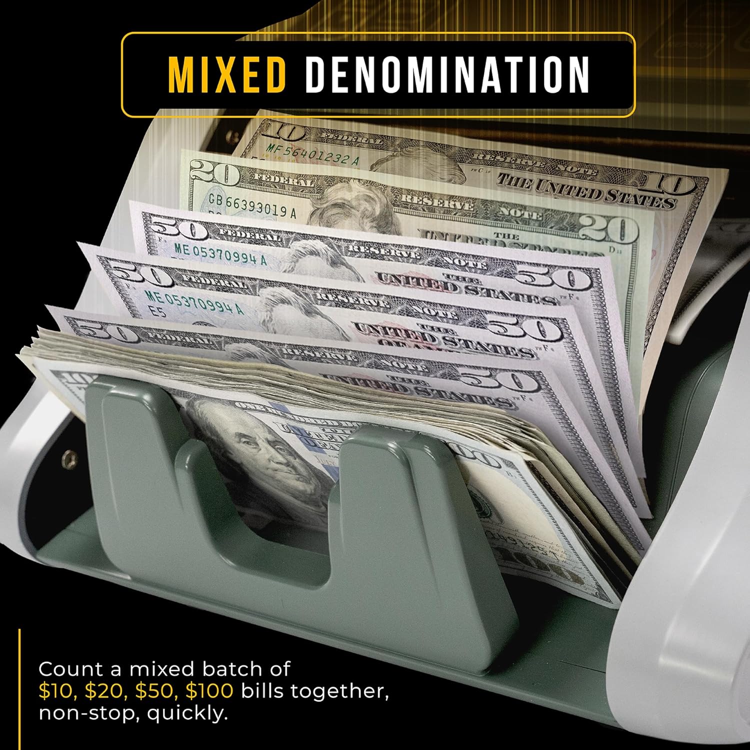 - MIX, SORT, COUNT, ADD, BATCH Modes. Multiple modes and functions for all business' money counting needs: MIX counts mixed denominations. SORT counts and sorts a single denomination. COUNT counts only the number of bills. ADD keeps the count of added bills. BATCH - Process bills in customized amounts. Anything you might need is in the box.