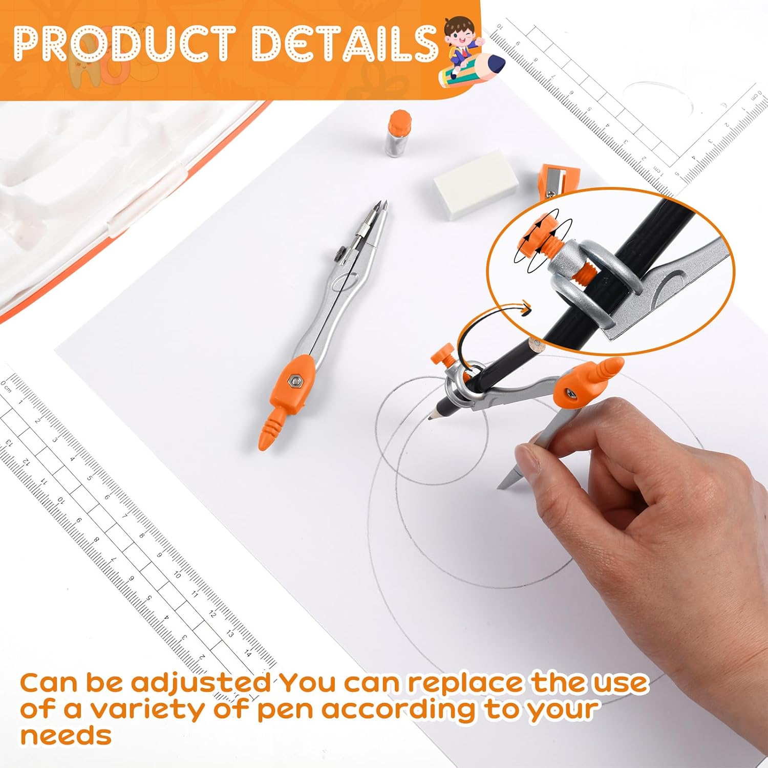 - Orange Color: the compass geometry tools come with orange color; Suitable for different people, you can give them to your students or friends, they will be very happy
