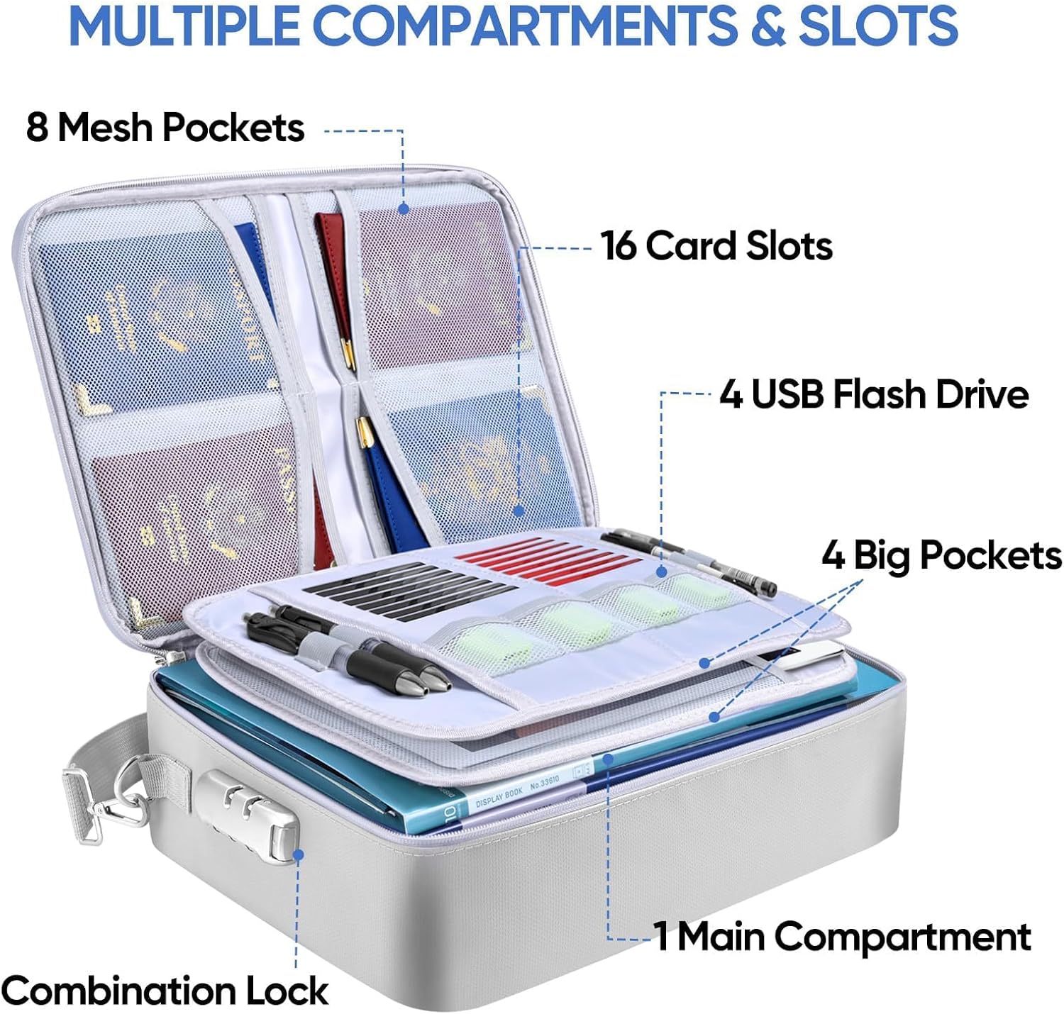 - Fireproof and Waterproof: The fireproof document box /bag is made of dust-proof silicone fiberglass, offering fire resistance up to 2192℉, SGS-certified (UL94 VTM-0); Its waterproof design protects your documents from rain and spills (No folders included)