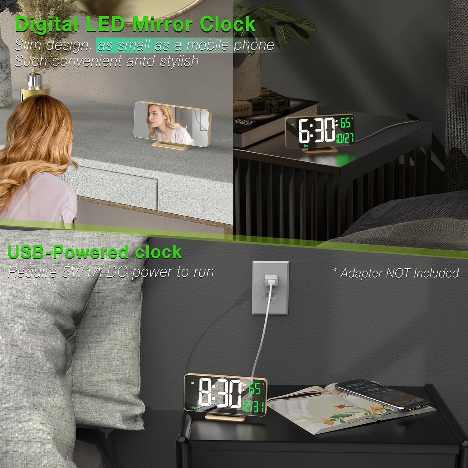 - [Golden Desk Clock] This is a stylish gold clock, features 6.7-inch display of mirror clock style, dual alarms, 12/24-hour format, date, day of week, seconds, temperature (℉ / ℃), and auto/manual dimming, it is also a cute and modern digital calendar for gold home decor. Additionally, the bright numbers make the LED digital alarm clock easy-to-read.