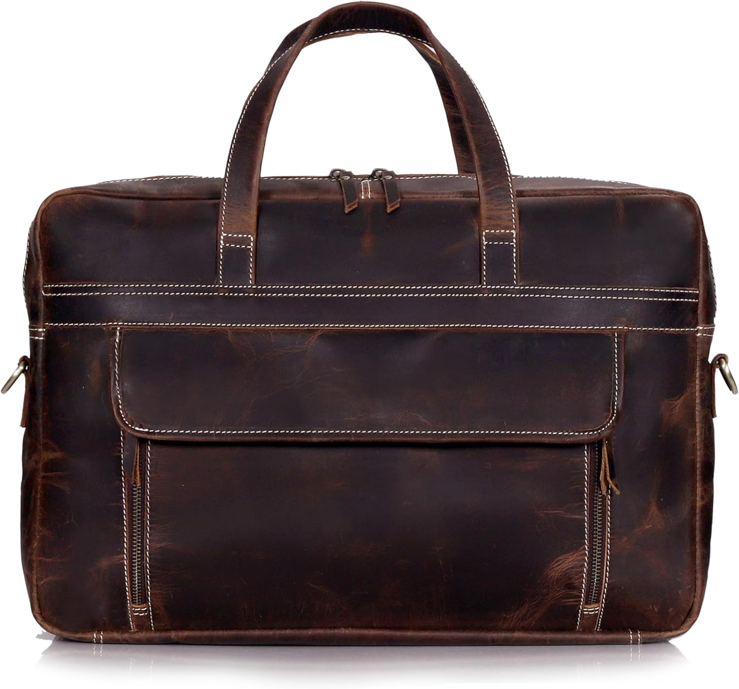 - Zipper closure New Arrival leather briefcase! Dimension: 17*13*5 inches (43*33*12.7cm), This men's briefcase fits up for 17.5" laptop. Item weight: 3.9lbs/1.8kg.