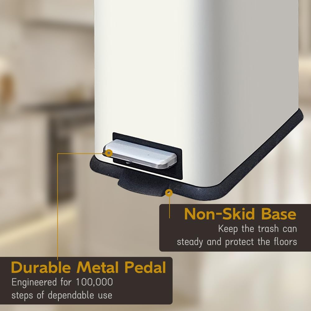 - Stable & Anti-Slip: Non-skid base keep your whtie garbage can firmly grounded, no matter the floor. And the strong steel pedal is engineered to last over 100,000 steps.
