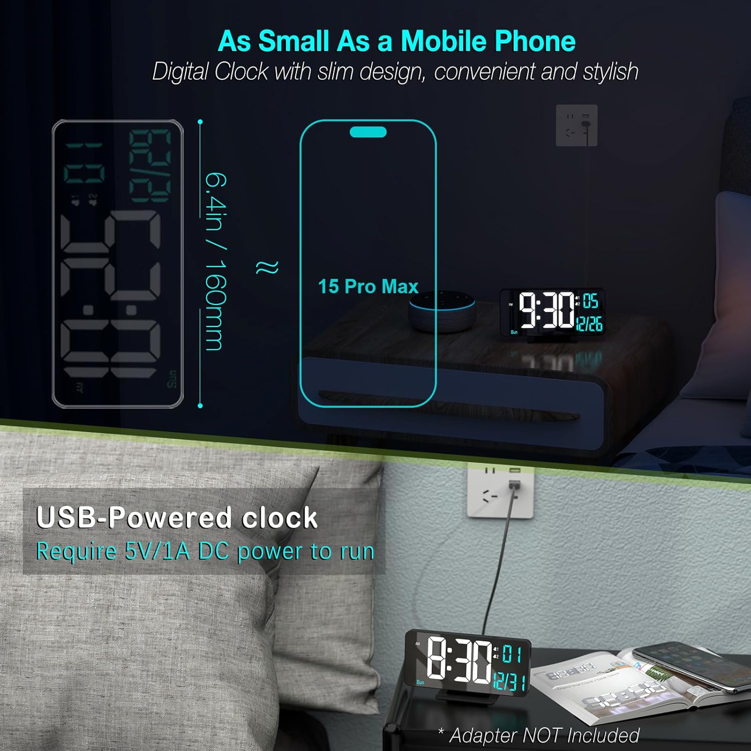 - [Plug-in USB-A Power Supply] This digital LED clock requires a 5V/1A AC adapter (not included) to operate. It also comes with a button battery, which is only used to preserve the time during power outages and is not meant to be used as a continuous power supply.