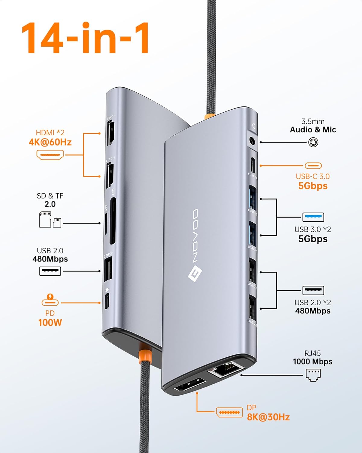 - đă14-in-1 USB C Docking StationăNOVOO USB C HDMI multiport hub equipped with 1*DP port, dual 4K HDMI ports, 2*USB A 3.0 ports, 1*Gigabit RJ45 port, 1*USB C PD100W charging port, 1*USB C data transfer port (speeds up to 5Gbps) and 3*USB 2.0 ports, SD/Micro SD card reader and 3.5mm microphone/audio port. Plug and play, no need to install any drivers or software.