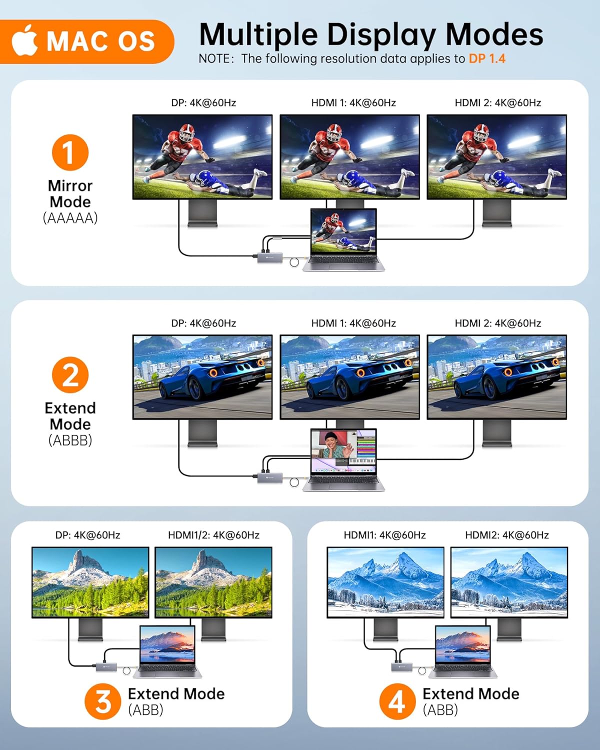 - đăPerfect visual enjoymentăThe DP single port of the USB C Hub supports up to 8K@30Hz/4K@120Hz, and the dual HDMI can directly transmit 4K@60Hz video to an HDTV, monitor or projector. With this USB C Dock, you can enjoy an ultra-HD movie experience and 3D visuals, and achieve ultra-smooth video gaming.đžFinal resolution depends on your device and connection, please check product guides and documentation or confirm with us.