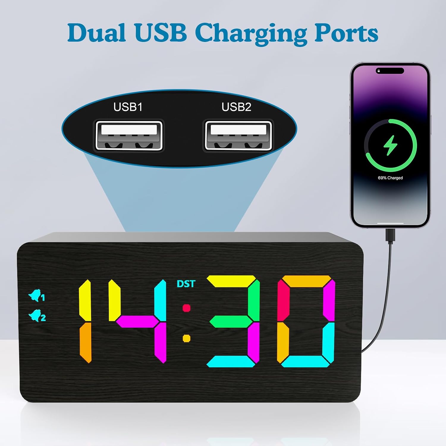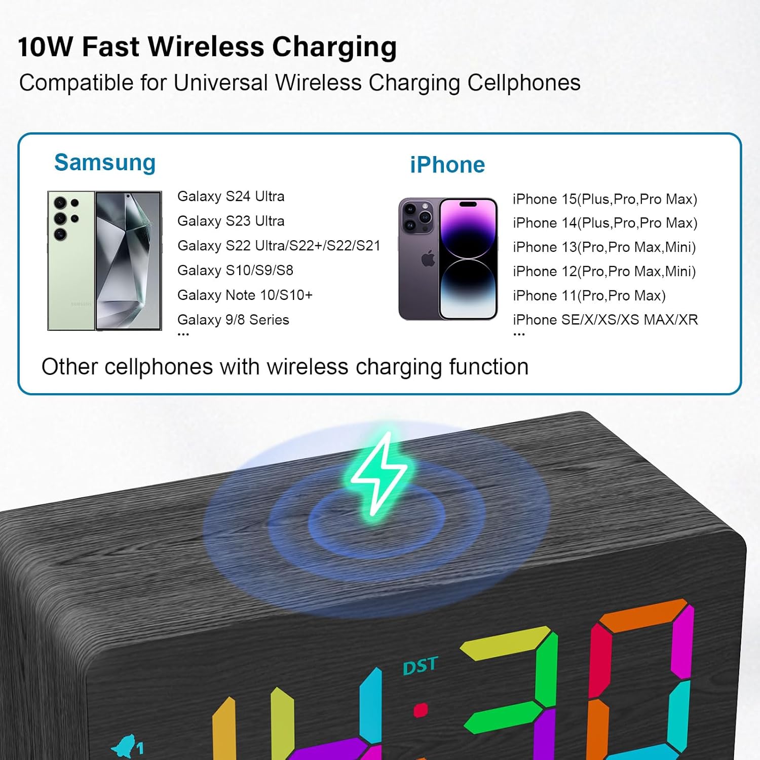 - Special Feature : Large Time Display with Bold Numbers, 0~100% Stepless Dimmer, 10W Fast Wireless Charging, 8 RGB Colors Display, Stylish Wood Grain Surface, Dual USB Charging Ports, Dual Alarm Clock, Snooze Button, Manual DST, etc. Large Time Display with Bold Numbers, 0~100% Stepless Dimmer, 10W Fast Wireless Charging, 8 RGB Colors Display, Stylish Wood Grain Surface,⌠See more