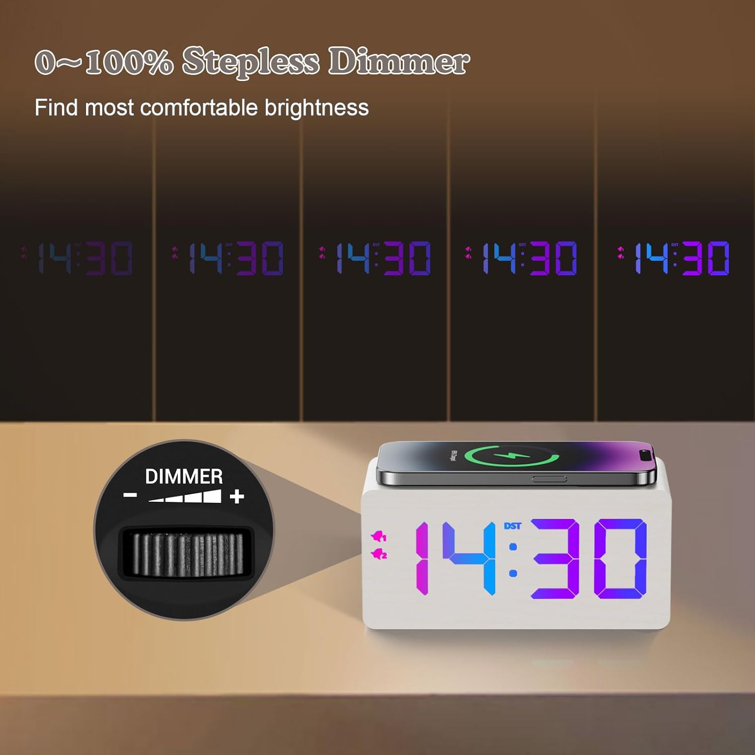 Wooden Digital Alarm Clock with Fast Wireless Charger, Dual USB Charging Ports, DST, Dimmable, Snooze, RGB Large Number Display LED Clock for Bedrooms, Living Room, Desk, Table, Bedside(White)