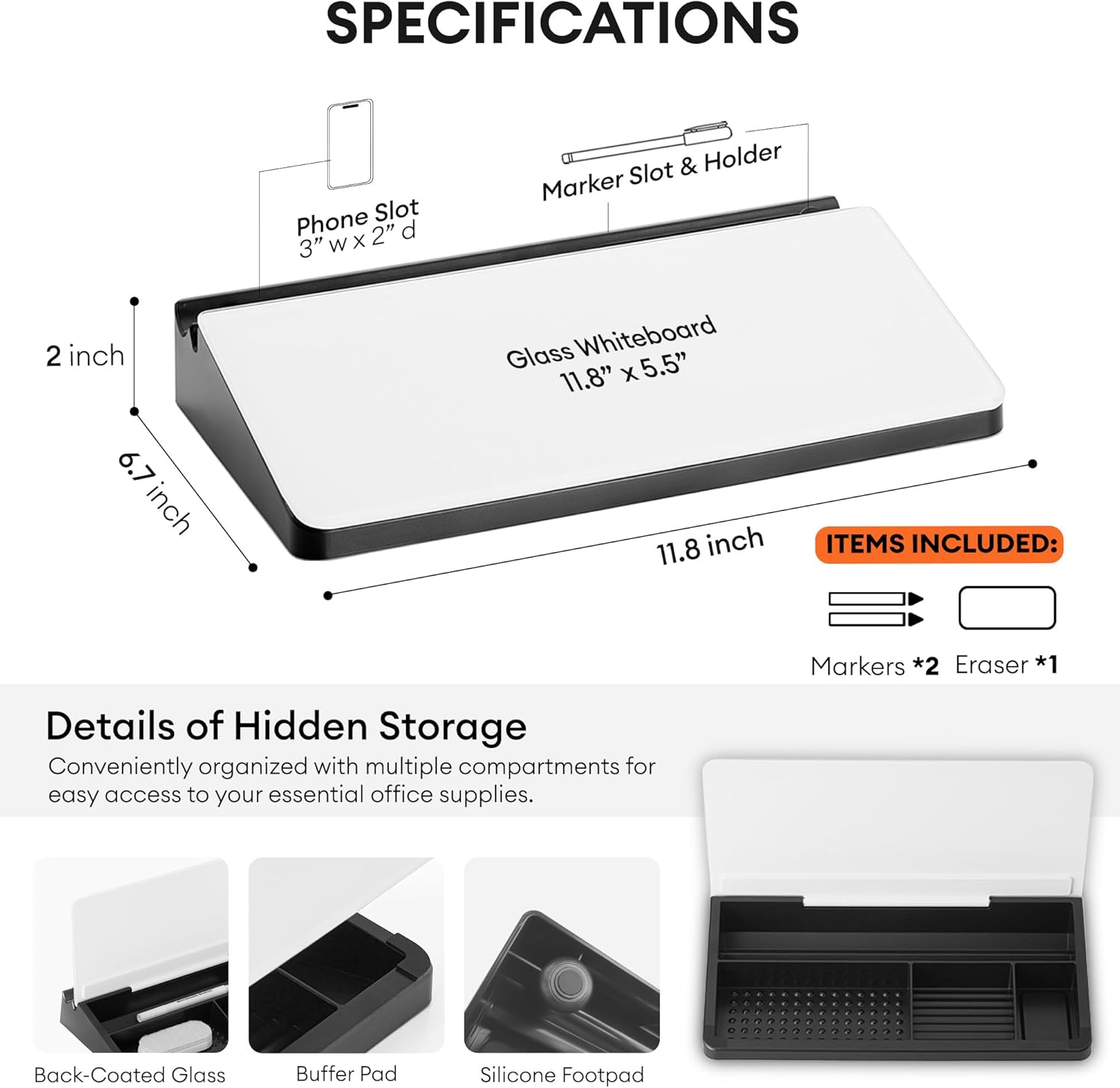 - CONVENIENT ACCESSORIES INCLUDED: The phone slot and pen tray integrated into the whiteboard's frame keep frequently used tools well within reach.