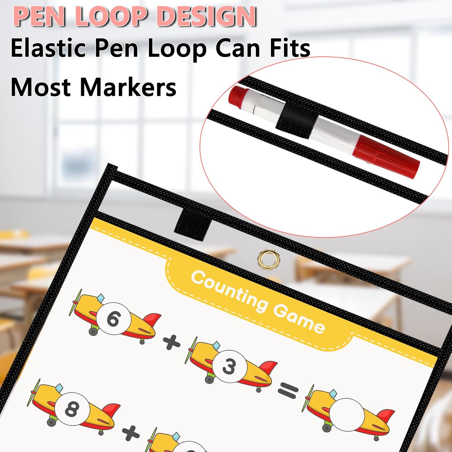 - Thoughtful design - Our dry erase paper sheet protectors design with an elastic pen loop at the top to hold your pen after use, and a 0.32" eyelet at the top for easy hanging or tying to a wall or student desk