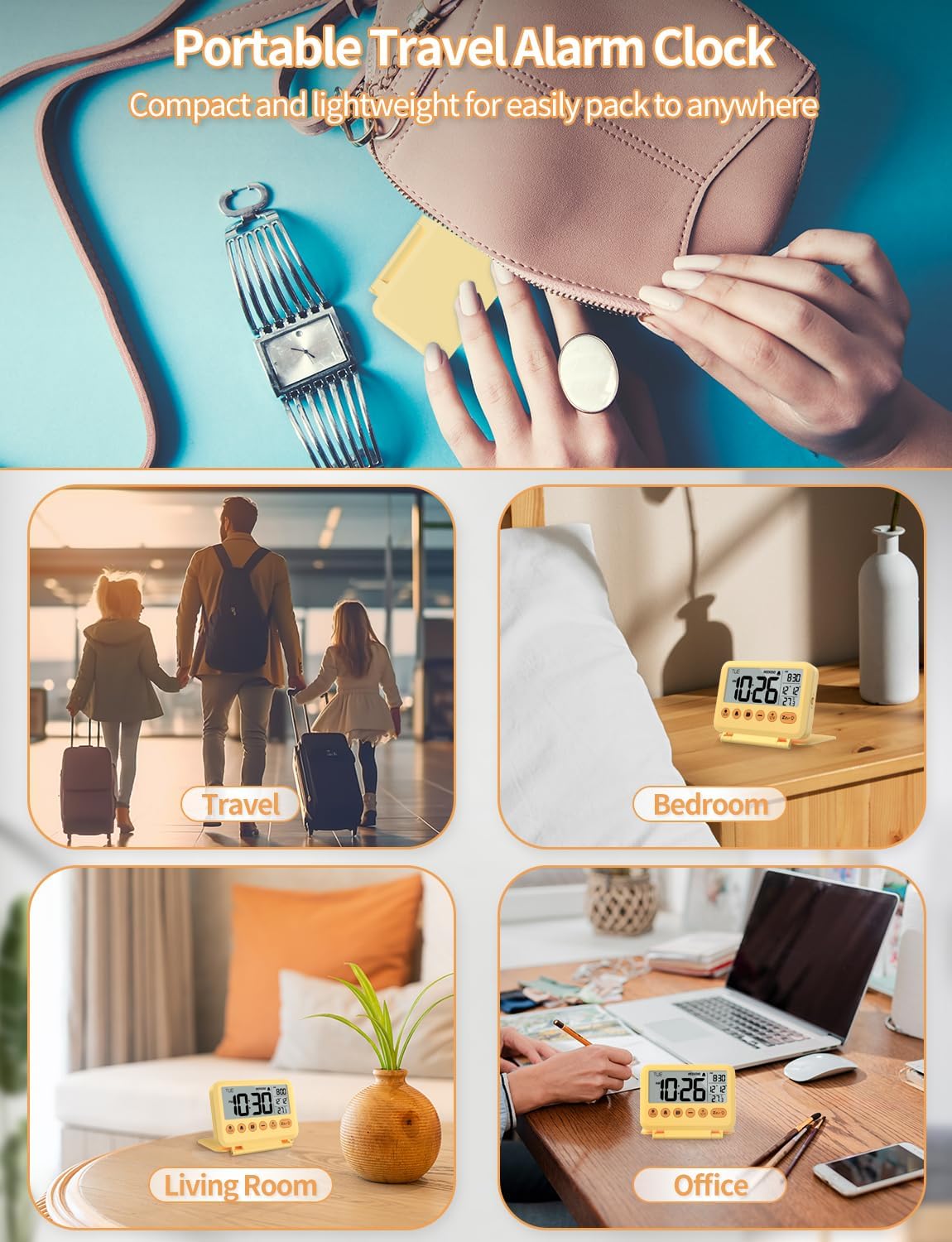 Digital Travel Alarm Clock - 3.54 inch LCD Display, 9-Minute Snooze, 2 Volume Levels, Backlight, Battery Included (Yellow)