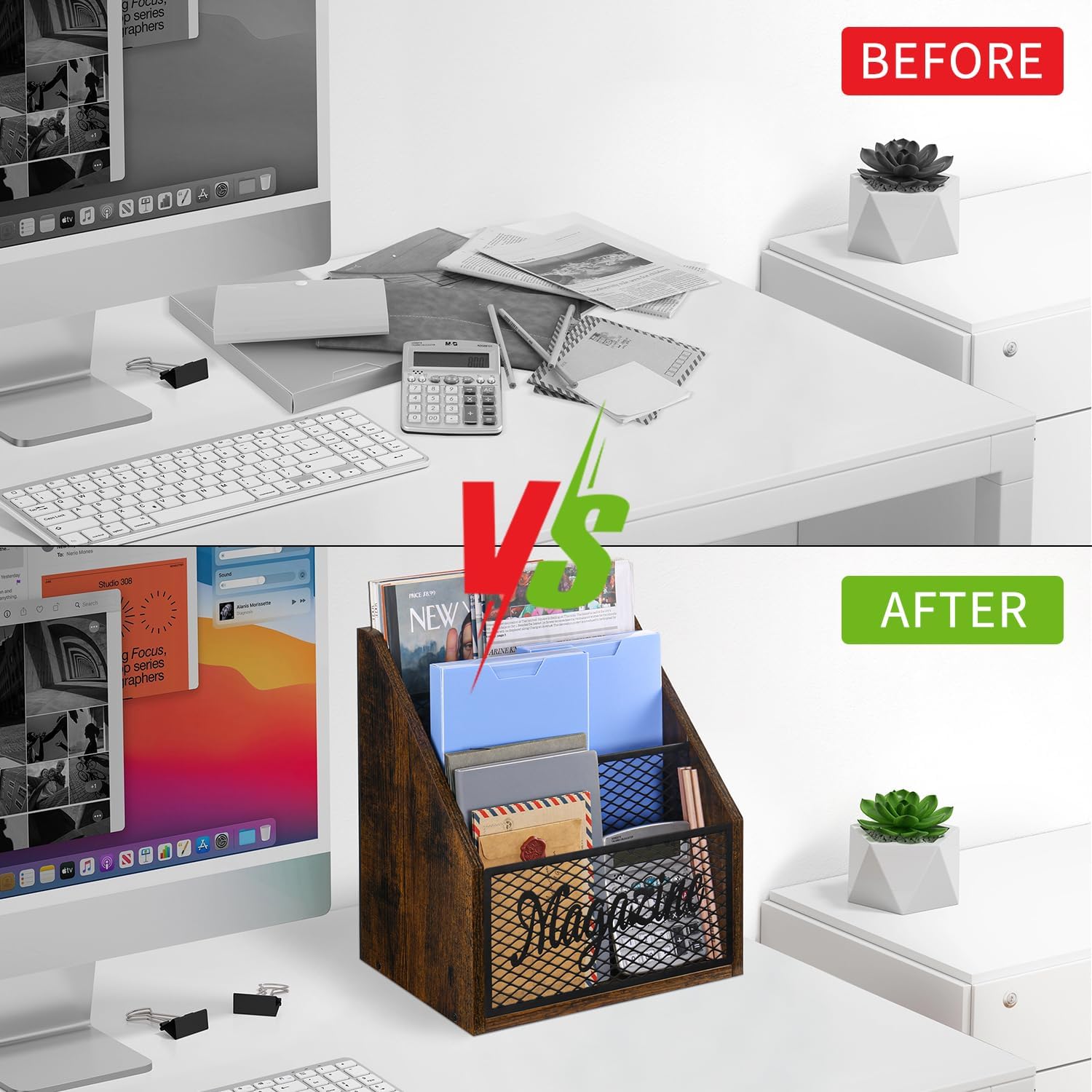 - Unique Sloped Design:Unlike other magazine holders,the magazine rack boasts a special design with three stepped sloped compartments, an exclusive creation by our designers.Ergonomically designed, it allows for easy retrieval and placement of magazines and documents.Different lengths of files can be placed in varying depth compartments,effectively organizing mail,bills,magazines,and office documents.