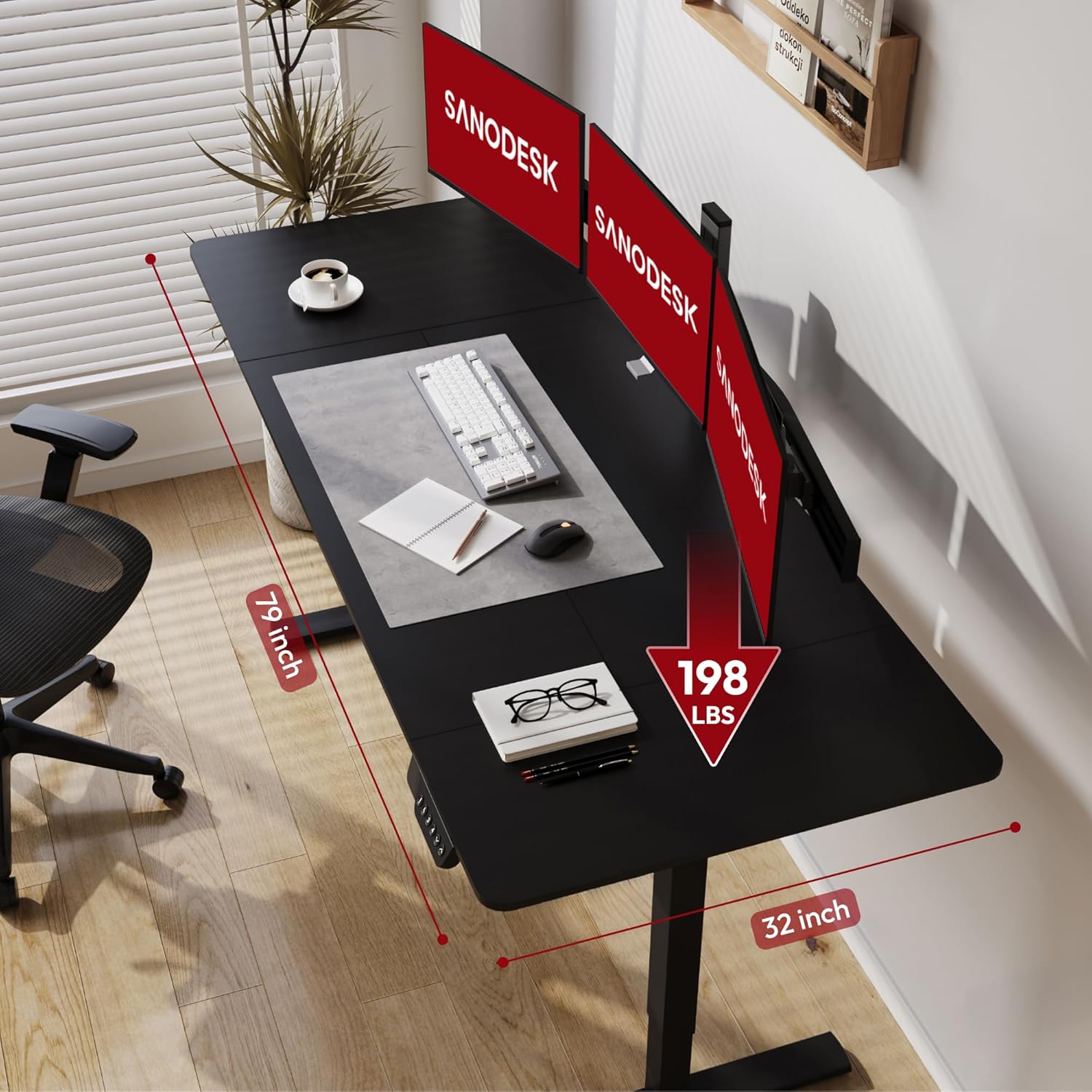 SANODESK Electric Standing Desk 79x32 Inch Height Adjustable Stand Up Desk Home Office Computer Workstation Sit Stand Home Office Desk with Splice Board (Black Frame + Black Top)