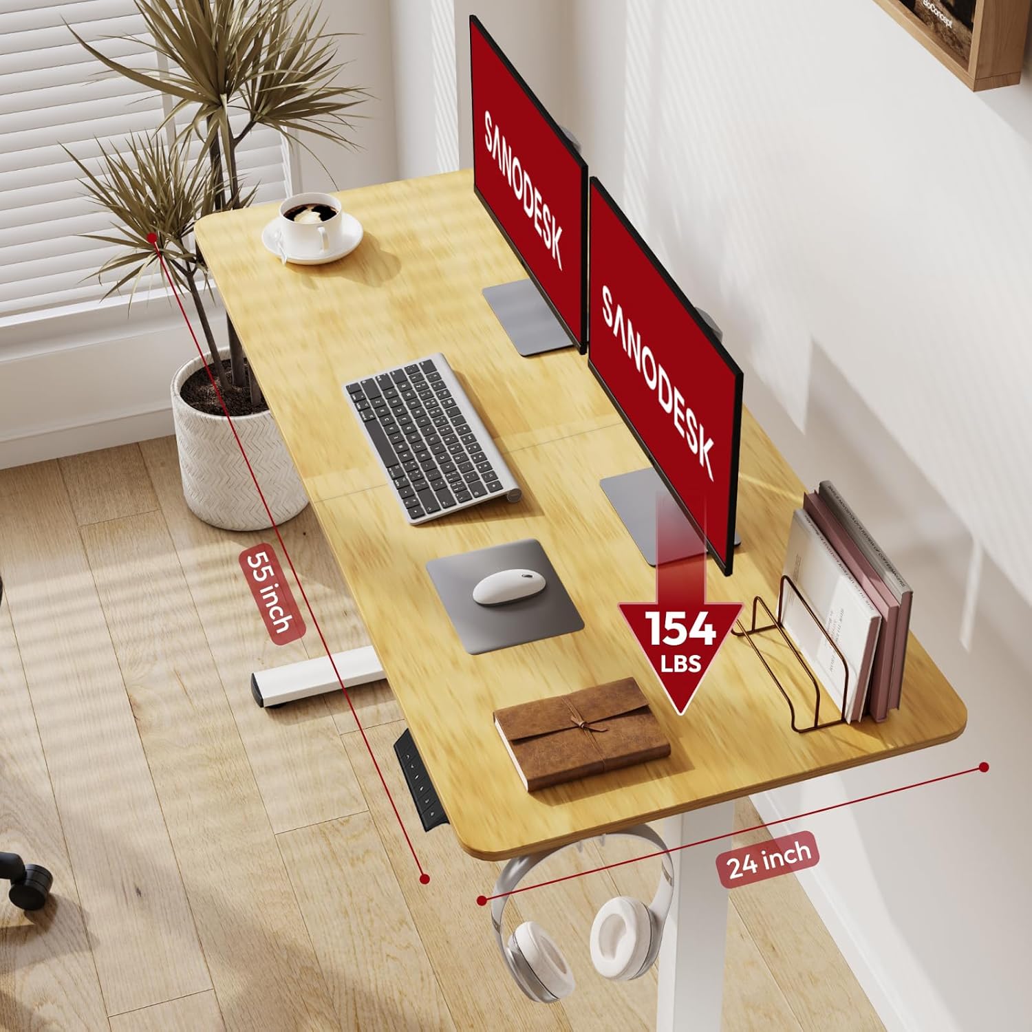 SANODESK Electric Standing Desk 55x24 Inch Height Adjustable Stand Up Desk Home Office Computer Workstation Sit Stand Home Office Desk with Splice Board (White Frame + Maple Top)