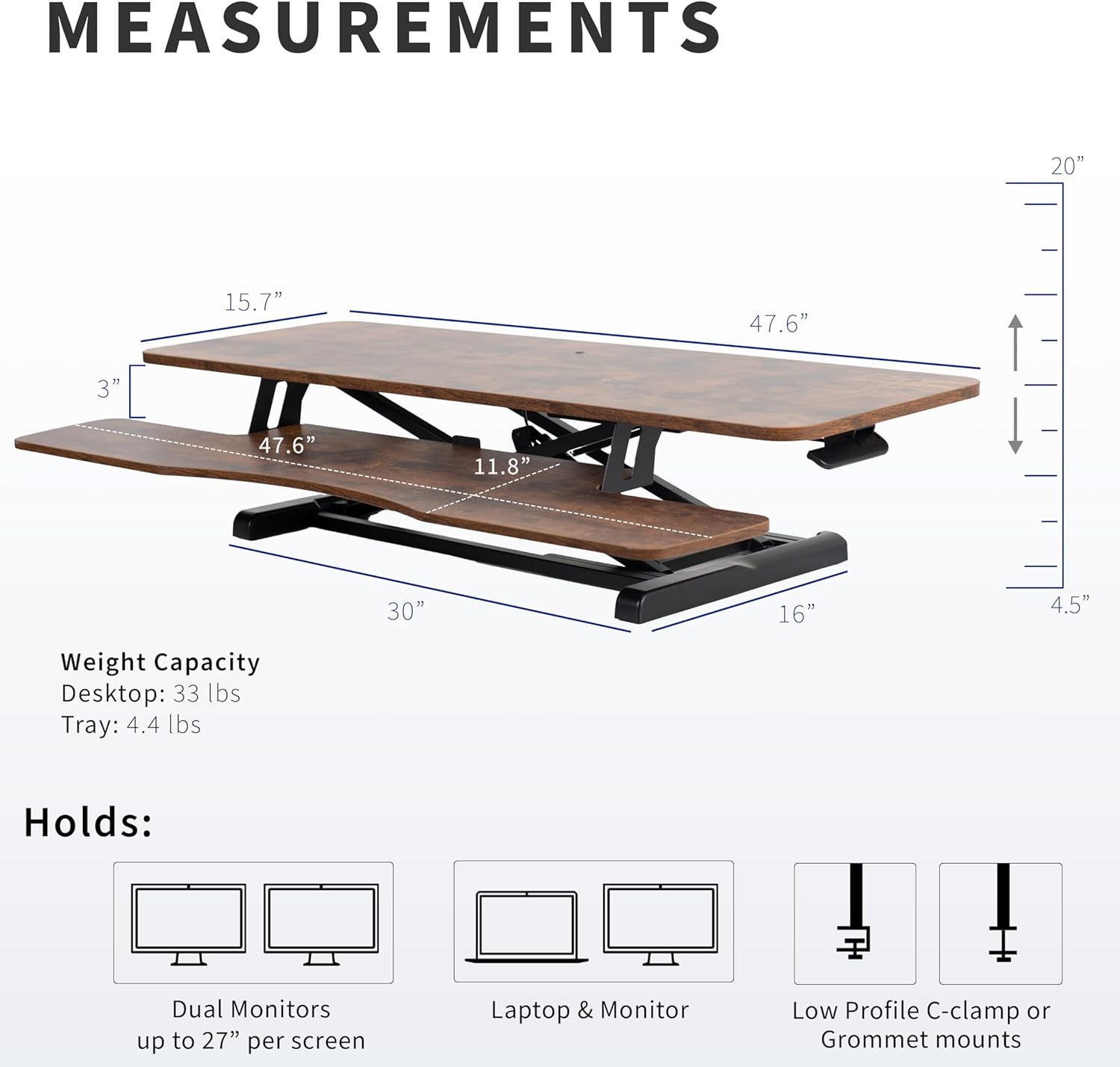 VIVO 48 inch Desk Converter, K Series, Height Adjustable Sit to Stand Riser, Dual Monitor and Laptop Workstation with Wide Keyboard Tray, Rustic Vintage Brown Top, Black Frame, DESK-V048KN