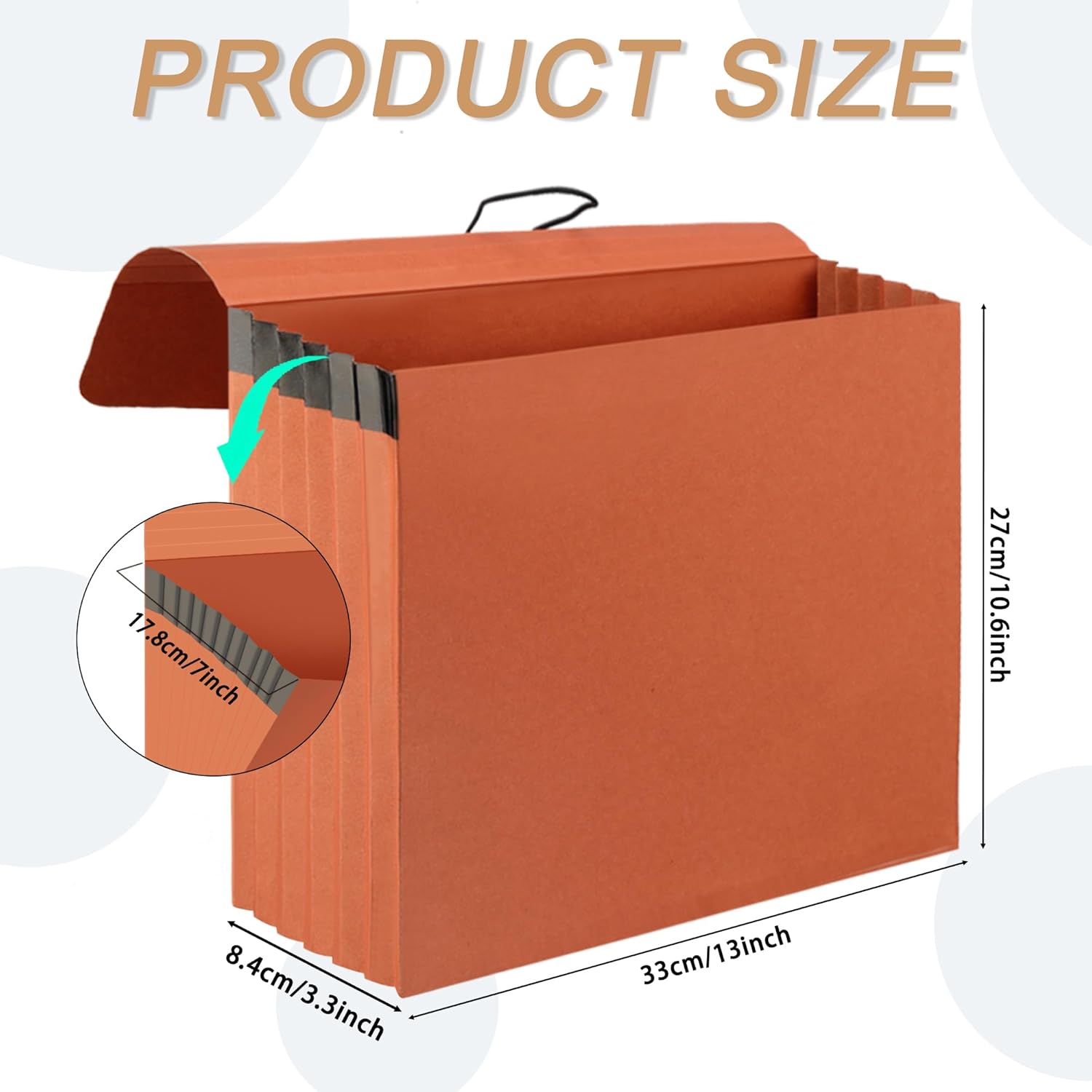 - Size:The accordion folder is 13"H x 10.6"W,the standard unfolded size is 3.3",and the maximum unfolded size is 7 inches,providing you with ample storage capacity to meet your daily needs.