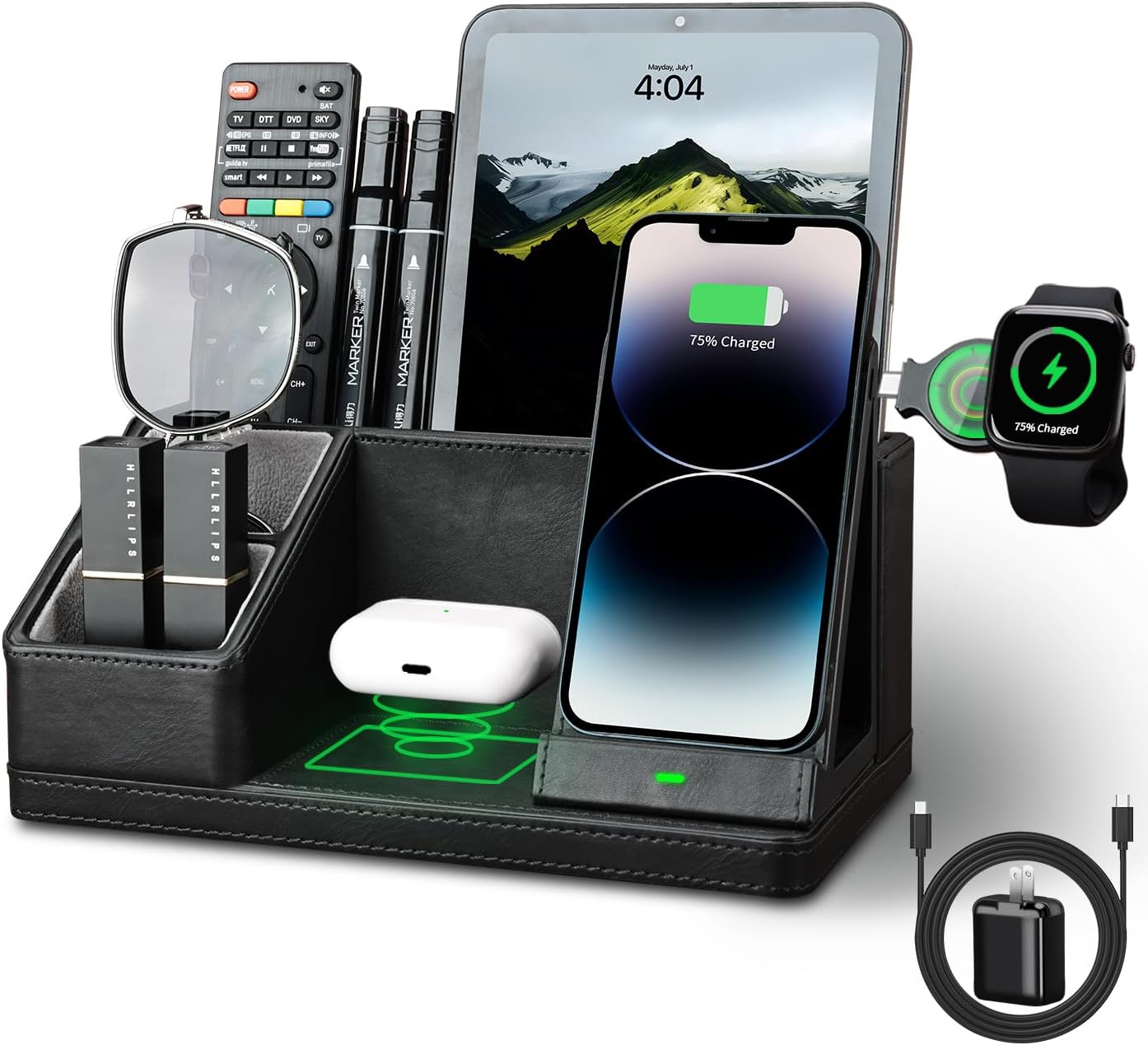 - â¶ăMulti-Functional Organizer with Charging Stationă: This all-in-one desk organizer with wireless charging station, with dedicated spots made for your iPhone/Apple Watch/AirPods charging at the same time; and keeping your pens, remote control, glasses, and other daily-used small things. Say goodbye to tangled cords and enjoy wireless charging by simply laying your device on the charging stand, no more plug-in/ out troubles.