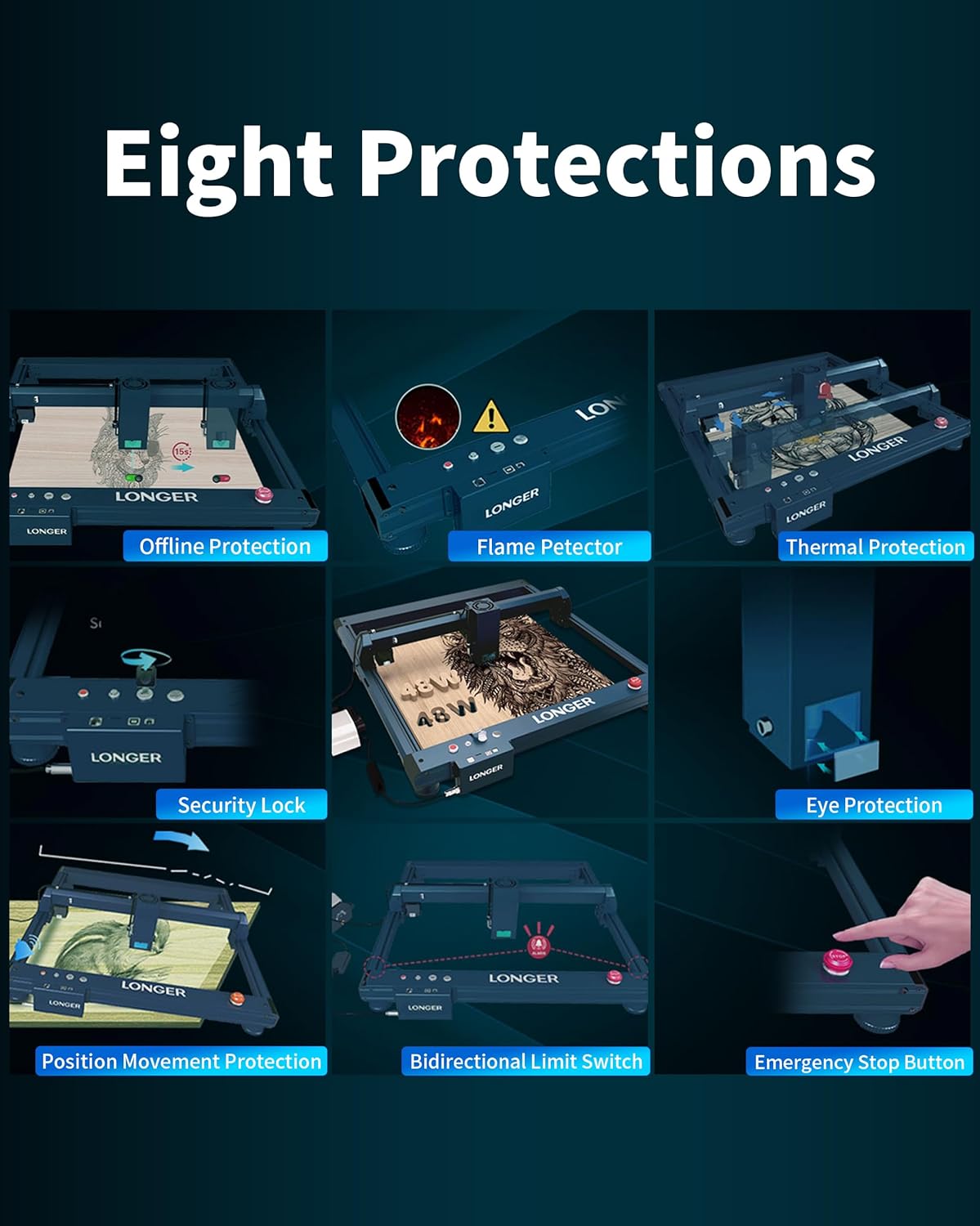 - Eight Safety ProtectionďźSafety Lock: Restrict children from using the engraver; Laser Module Panoramic Filter Glass: Block blue light and filter 97% UV to protect eyes; Position Movement Protection: Stop the machine if it moves or tilts during operation; Flame Detector: Prevent wood burning for worry-free engraving; two Way Limit Switch: Alarm-triggered auto zero for laser head protection; Emergency Stop Button: Stop the machine for safety in accidents; Offline Protection; Thermal Protection