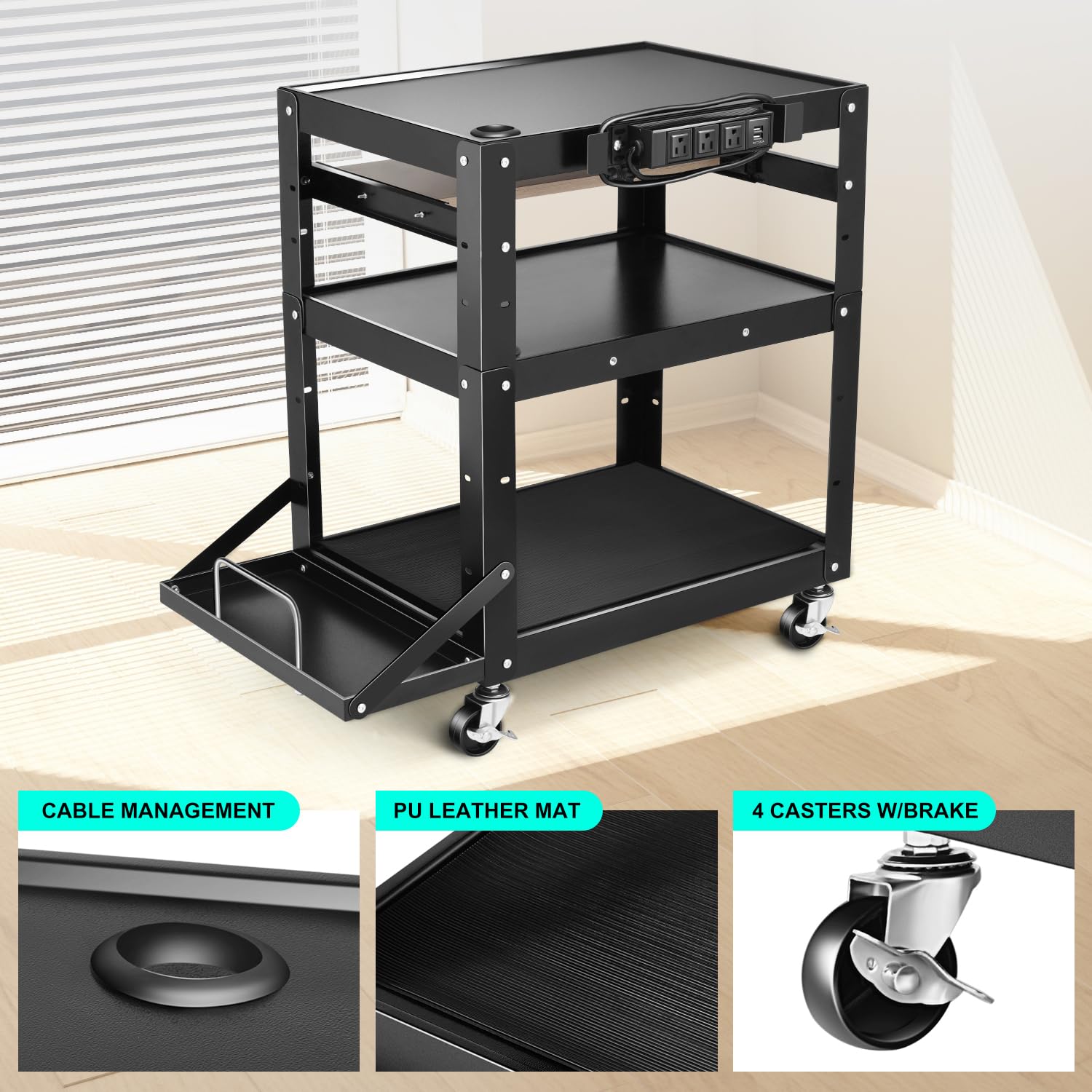 - STEEL AV CART WITH POWER - This presentation cart is equipped with a power strip, which has 3 outlets and 2 USB ports provided for users to charge more devices. In addition, you can find a cord management wrap on the shelf to keep your cables organized