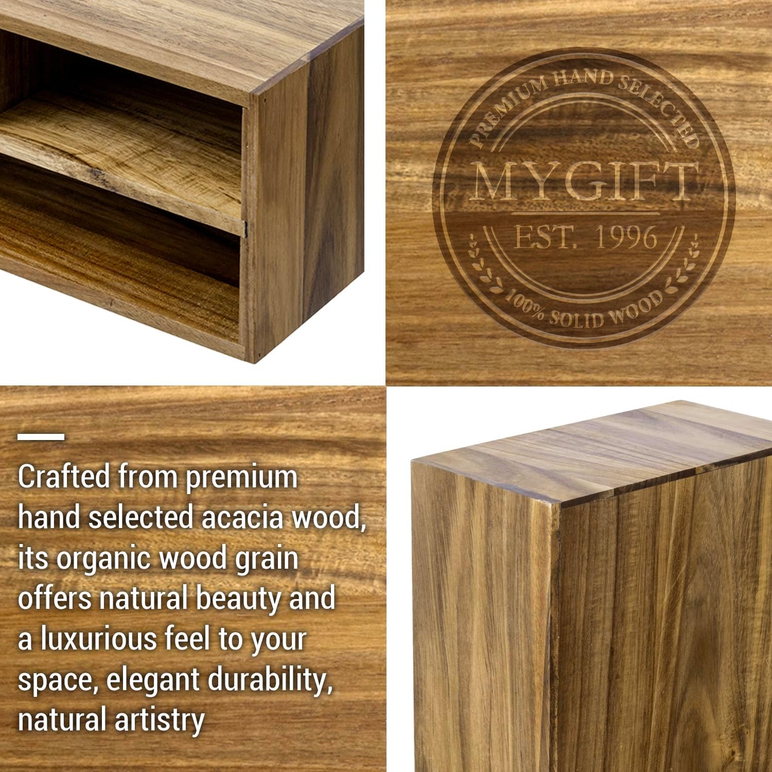 - Desktop organizer is crafted from high-quality sustainable acacia solid wood with a natural brown finish for a modern rustic aesthetic