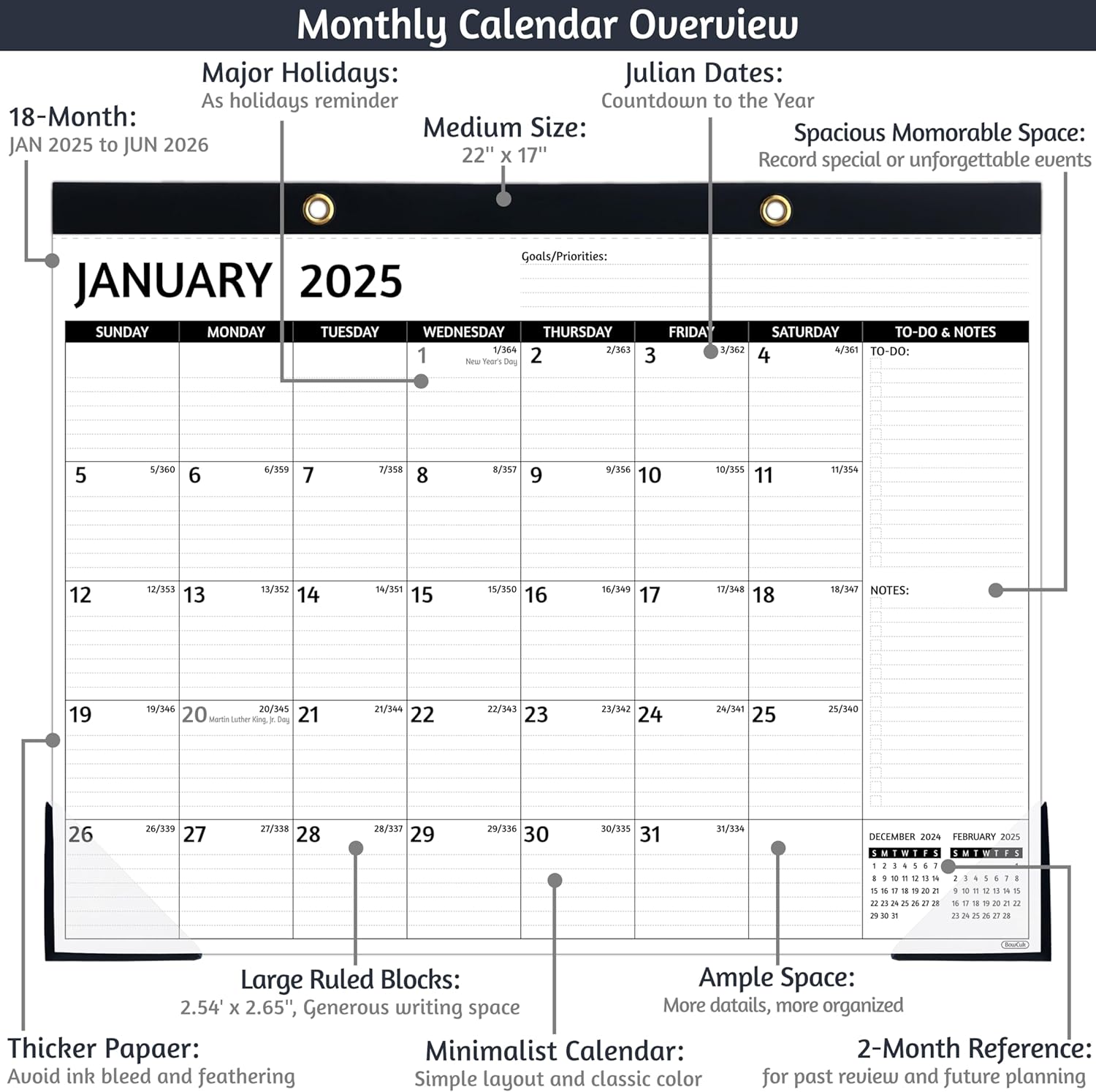 2025-2026 Desk Calendar β Jan 2025 β Jun 2026, 18 Monthly Calendar 2025-2026, Large Desk Calendar, 22'' x 17'', 2025 Desk/Wall Calendar with Desk Pad, To-do Lists, Ruled Blocks, Corner Protectors