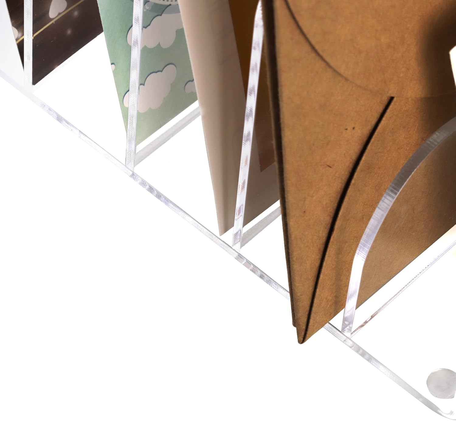 - Acrylic Desk Organizer Size: Measuring 8.5(L)x 6.8(W) x 4.7(H) inches, this vertical file holder is designed with spacious storage capacity, organizing your files in 5 slots of file holder without hurting one finger. Each section is wide enough to hold 1.18 inch (30 mm) width items