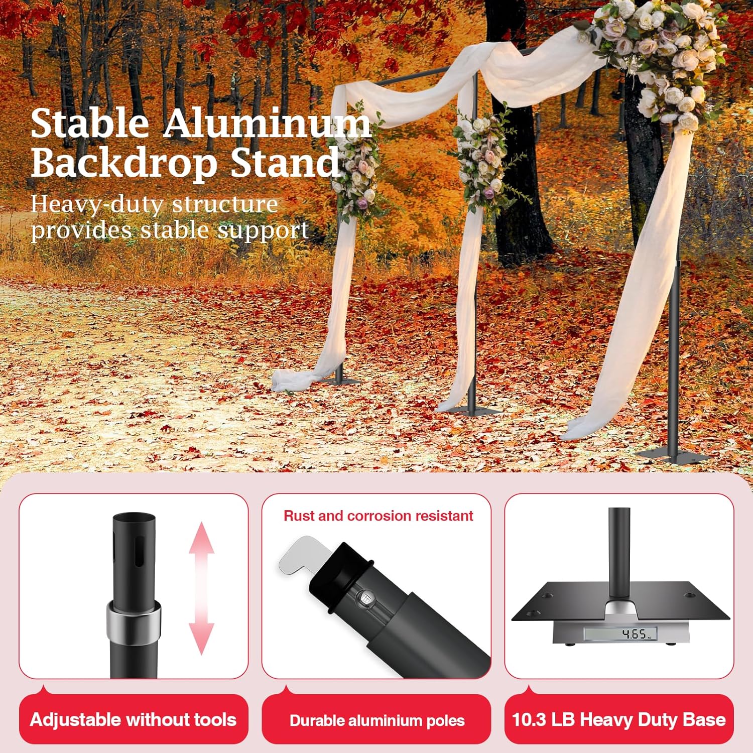 - 【 Wide Application】This decoration backdrop stand is perfectly suitable for weddings, parties, birthday, baby shower, photography, photo booths, banner stand backgrounds, business events and so on. You can hang drapes, balloons, string lights and flowers to make your backdrop stand amazing