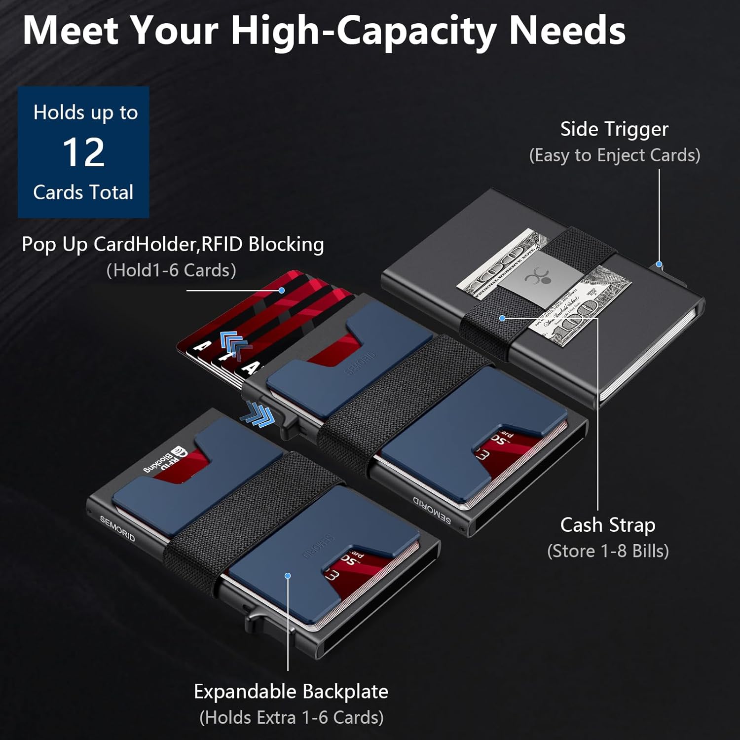 Slim Aluminum Card Holder Wallet for Men, Durable Expandable Backplate, RFID Blocking Minimalist Metal Pop Up Wallet, Holds 12+ Cards Plus Cash