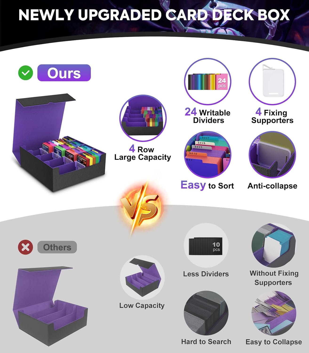 - Upgraded Ultra Capacity Card Deck Box: Our card storage box upgrades 33.3% in capacity from a standard 3-row box to a 4-row box. This TCG deck box can fit 3000+ sleeveless cards, 1800+ single-sleeved cards, or 1500+ double-sleeved cards with ease, excluding top loaders and magnetic holders.