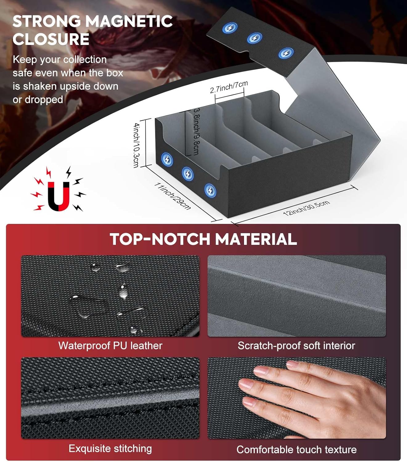 - Premium Material & Magnetic Closure: This large trading card box features a sturdy PU leather shell, waterproof, scratch-resistant, and wear-resistant, offering firmly shock protection. And a soft microfiber interior protects your cards from scratches. Equipped with powerful magnetic closures, providing security for your cards when shipping. It's an ideal choice for deck card players!