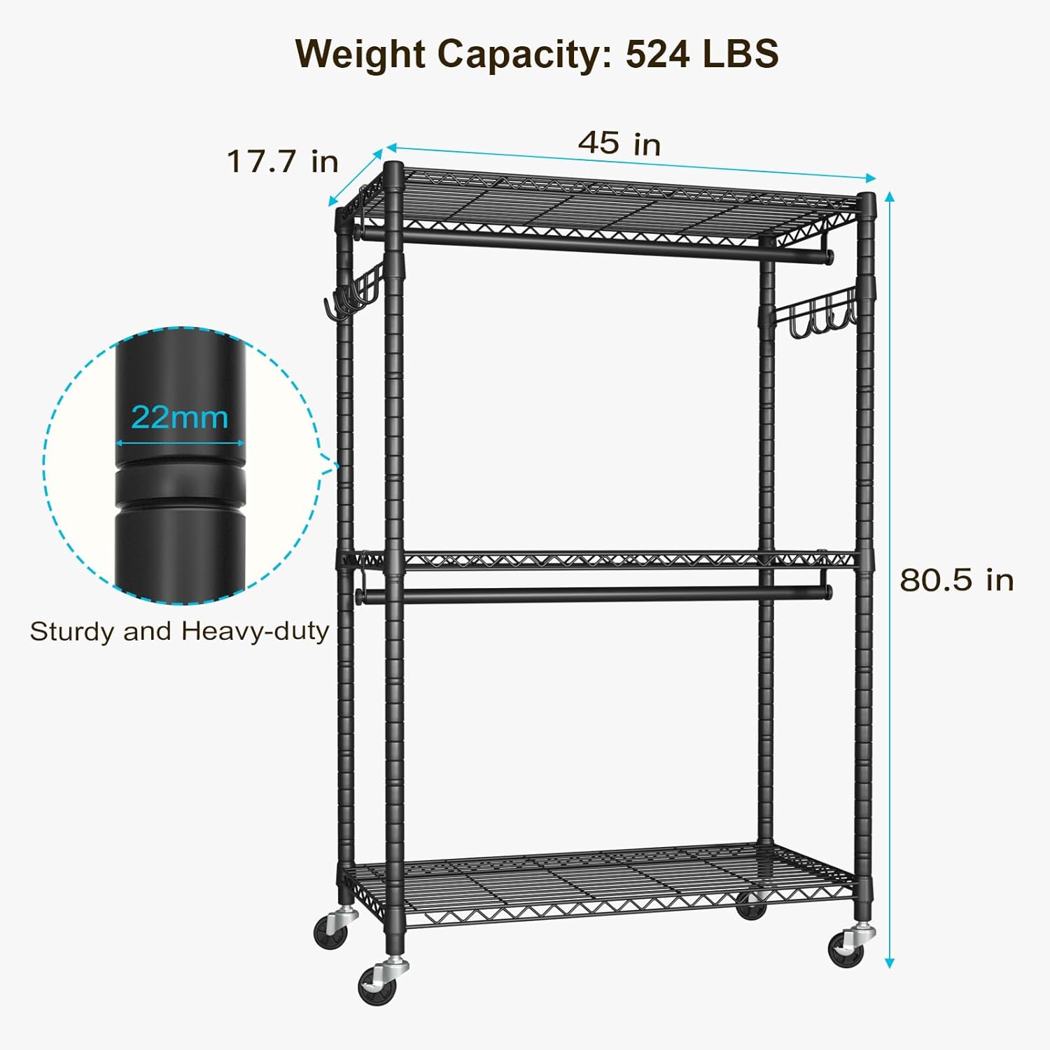 - [Dimension & Load Weight]: 45"W x 17.7"D x 80.5"H(Included wheels height) with 22mm diameter poles, max load 524 pounds