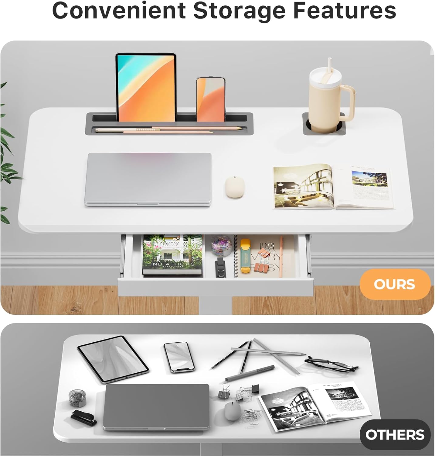 - Convenient Storage Drawer: Small standing desk features a drawer (Size: 14.4"Ă—8.4"Ă—1.3") that offers generous storage for office supplies, helping maintain a clean workspace. Additionally, 2 hooks design facilitates organization of headset or backpack