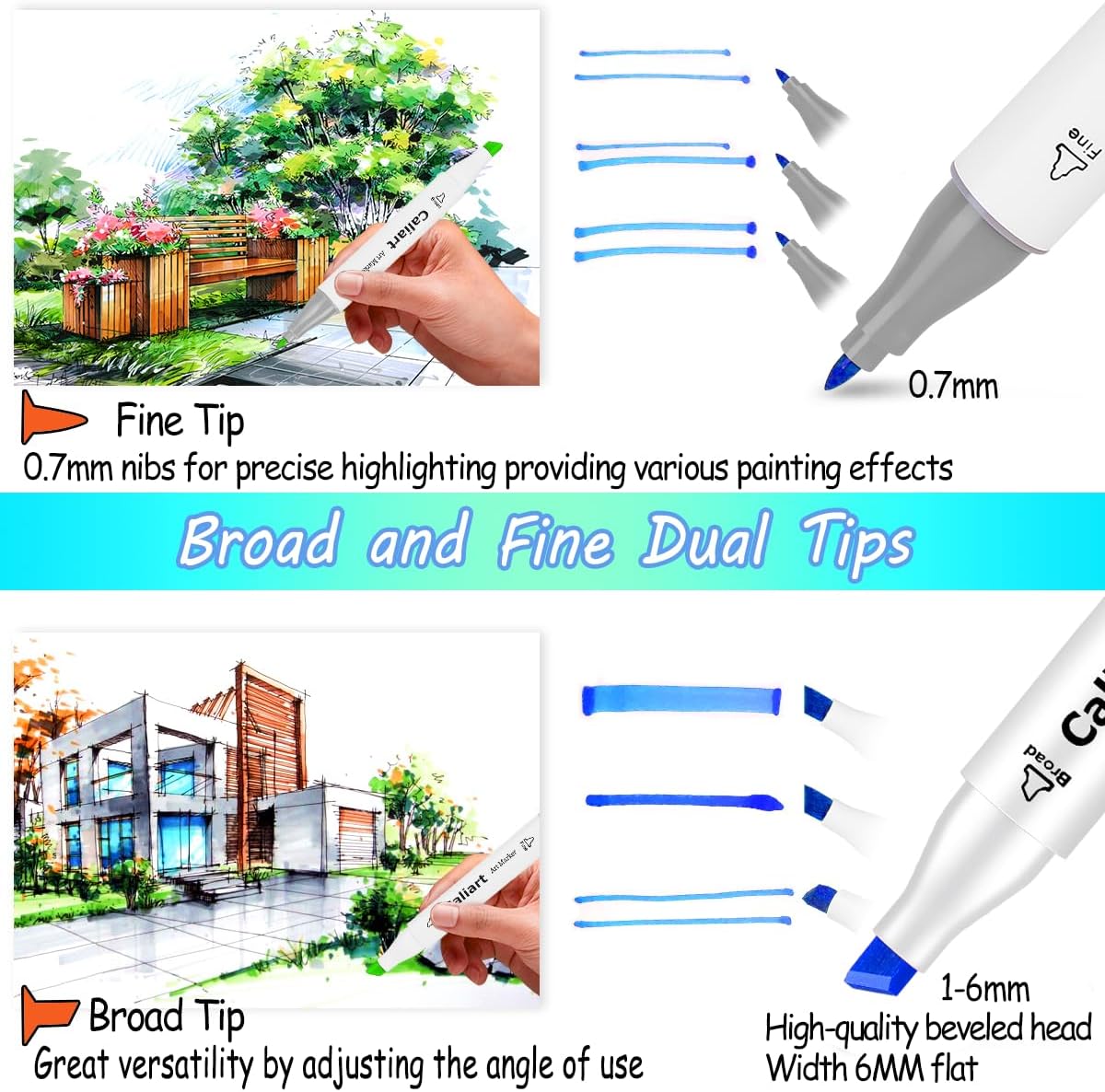 - 🎨 Fine & Broad Chisel Double Tip with Alcohol Markers Brush Tip. Each Fine & Broad Chisel tip markers alcohol based has a double-ended design, providing great versatility. You can choose the brush tip markers for sweeping, details, calligraphic strokes or the broad chisel tip for quickly color in large areas. Alcohol Fine & Broad Chisel tip markers are more durable and do not fray.