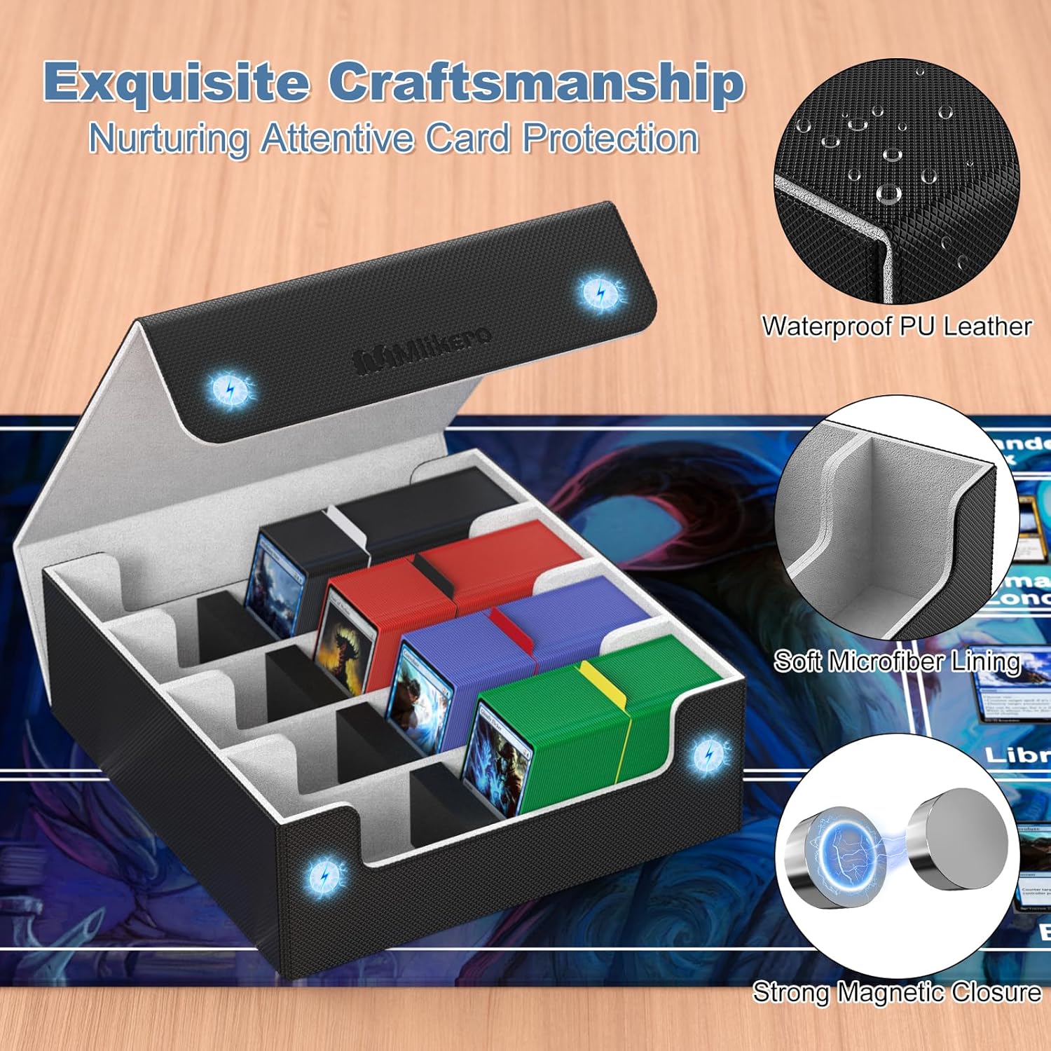 Mlikero Card Deck Case, 2400+ Trading Card Storage Box with 10 Colorful Dividers and 4 Foam Stoppers, Leather Magnetic Closure Commander Deck Box Fit for MTG, TCG (4 Rows, Black&Grey)