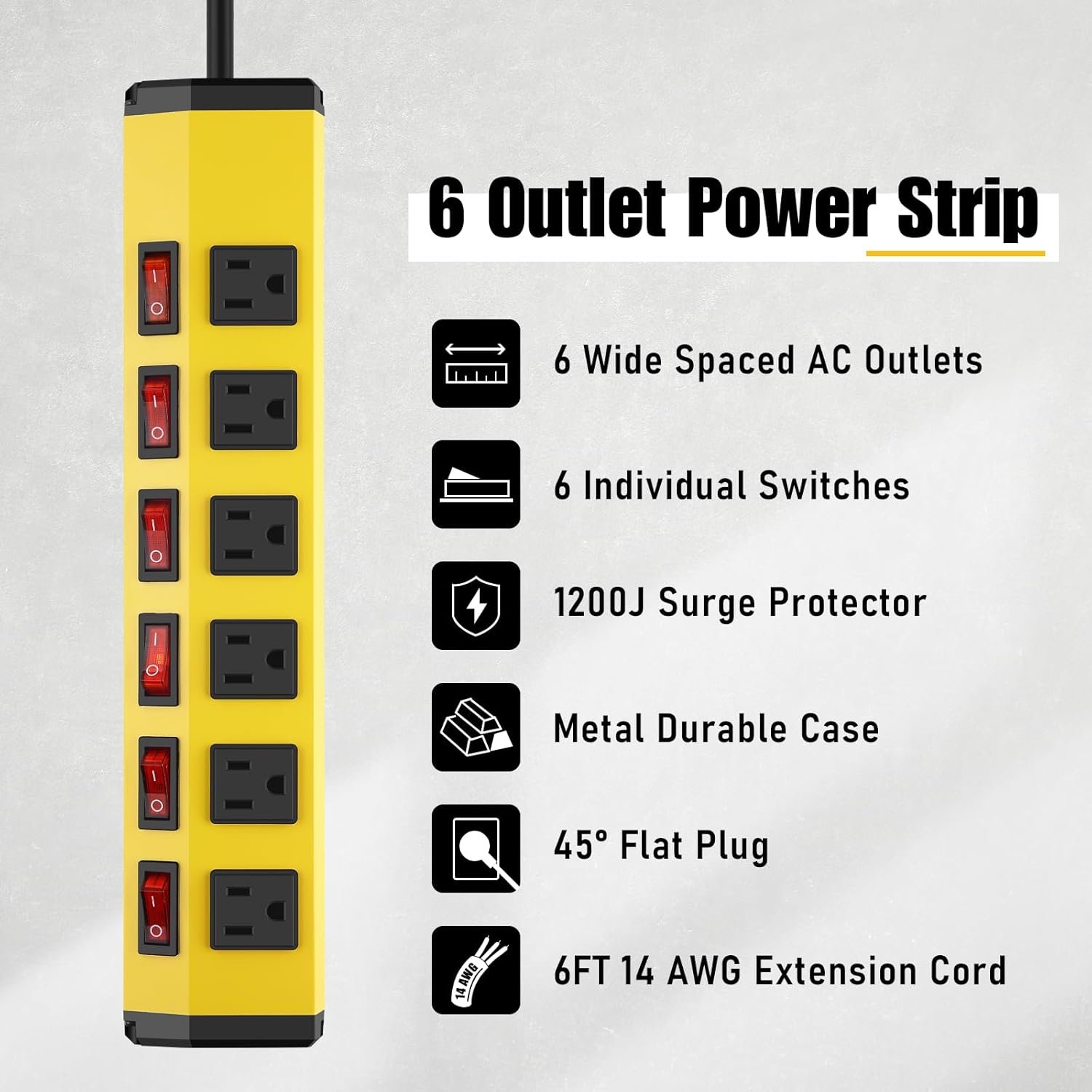 ANNQUAN 2PCS 6 Outlet Metal Power Strip with 6 Individual Switches,Heavy Duty Power Strip 1200J 15A 6FT Cord Home Office Industrial Commercial Shop
