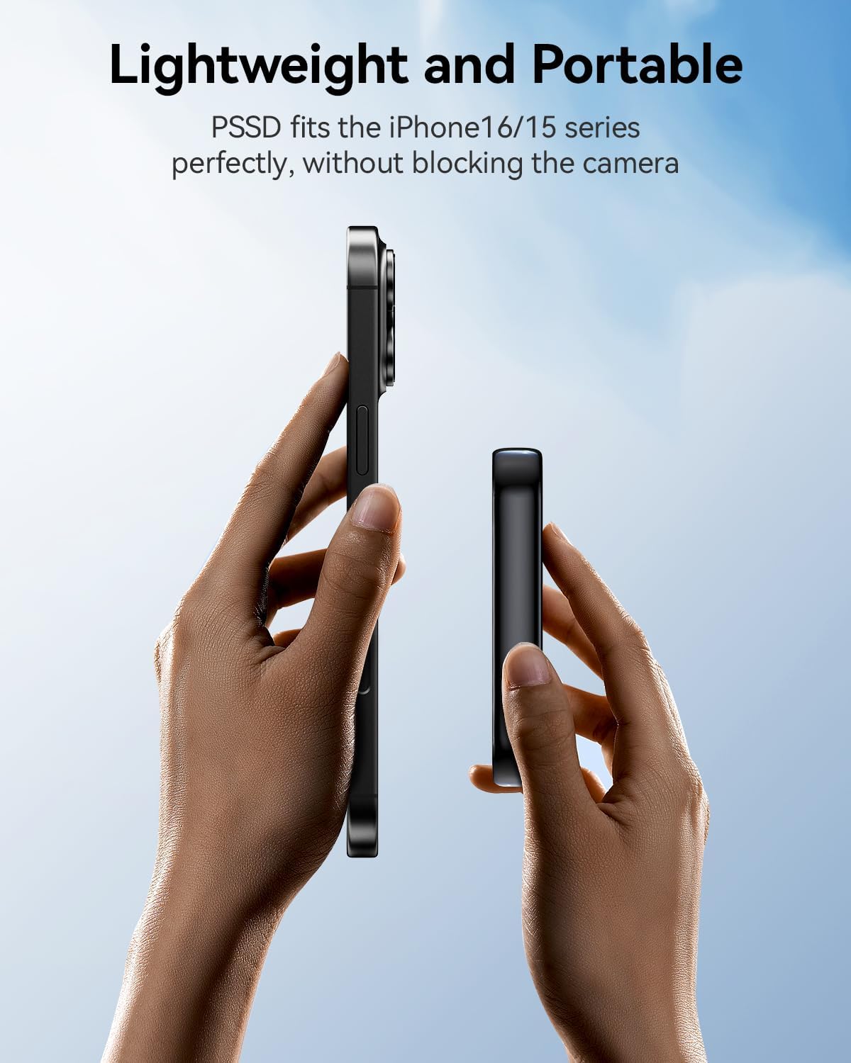 - ăMagnetic DesignăPSSD can be directly attached to iPhones and phone cases with MagSafe support, and it also includes a magnetic ring for attachment to devices and cases without built-in magnets. This makes it the ideal choice for mobile photography enthusiasts, allowing you to store a large number of high-resolution photos and videos anytime, anywhere, combining portability and efficiency perfectly.!!Note: When using the PSSD with a phone case, it is recommended to use the included magnetic ring to prevent detachment due to insufficient magnetic force.