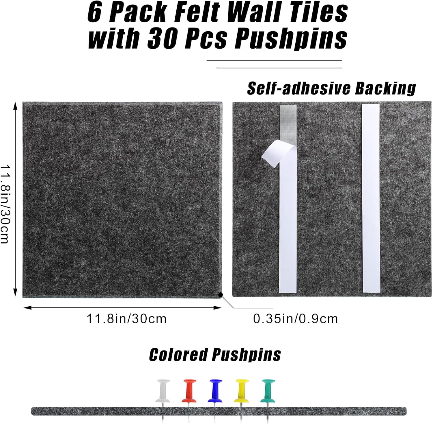 - 【Package Includes】You will receive 6 pack felt wall tiles and 30 pcs colorful thumbtacks (1 box). The size of each felt wall tile is 11.8" x 11.8" and the thickness is about 0.35". You can splice them into the desired shape and size according to your needs, such as 36" x 24", 12" x 72", etc.