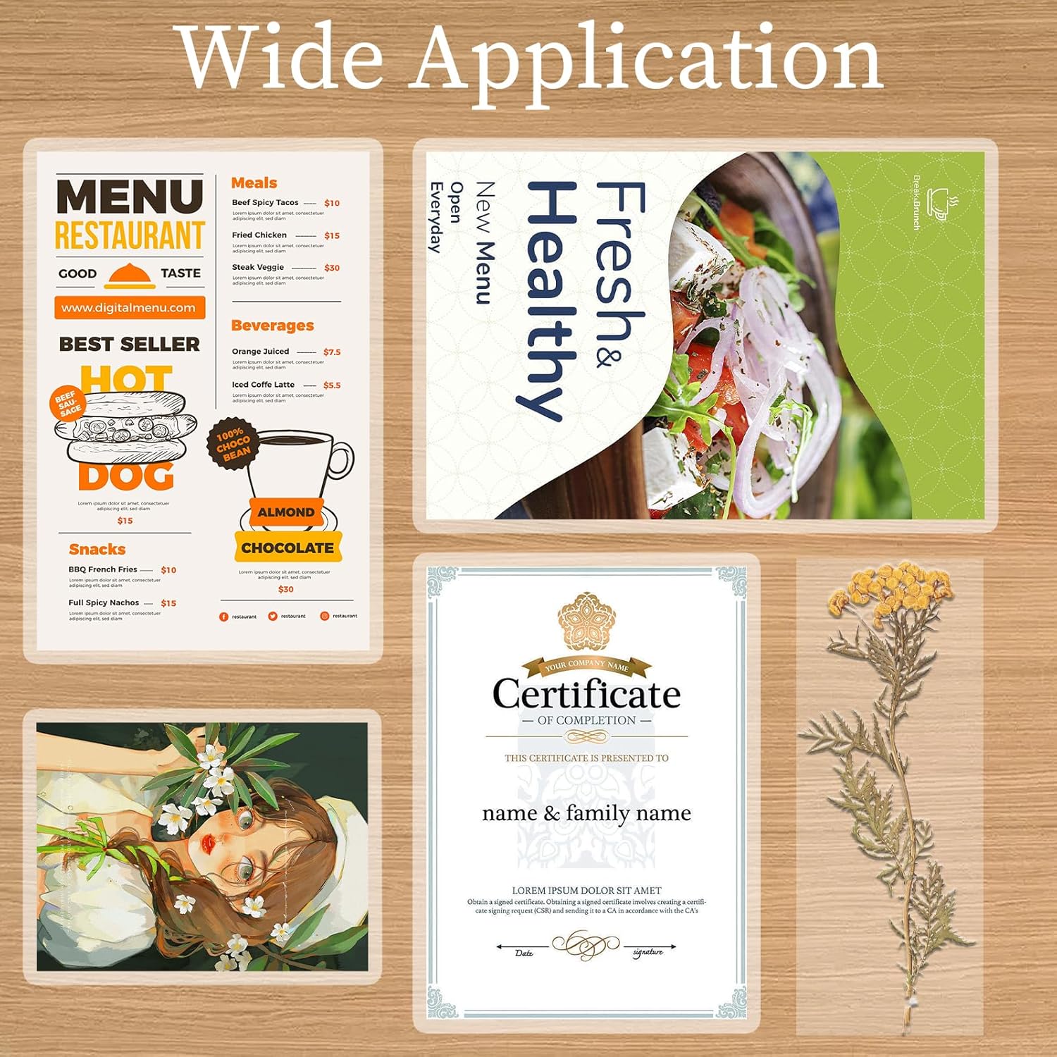 - đăWide ApplicabilityăCompatible with all thermal laminators. Not only for office work, but also for crafting. Very suitable use for documents, certificates, photos, menus, invoices, decorative cards, logos, etc.