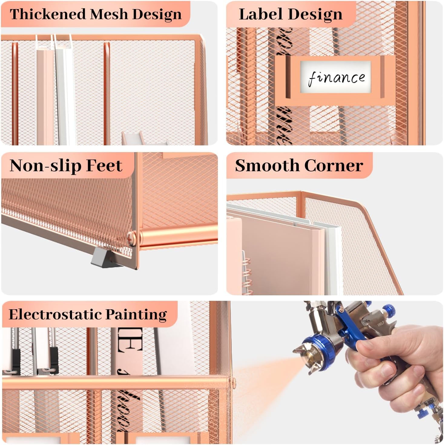 SUPEASY Desk Organizers Metal Desk Magazine File Holder with 5 Vertical Compartments Rack File Organizer for Office Desktop, Home Workspace, Rose Gold, Plus