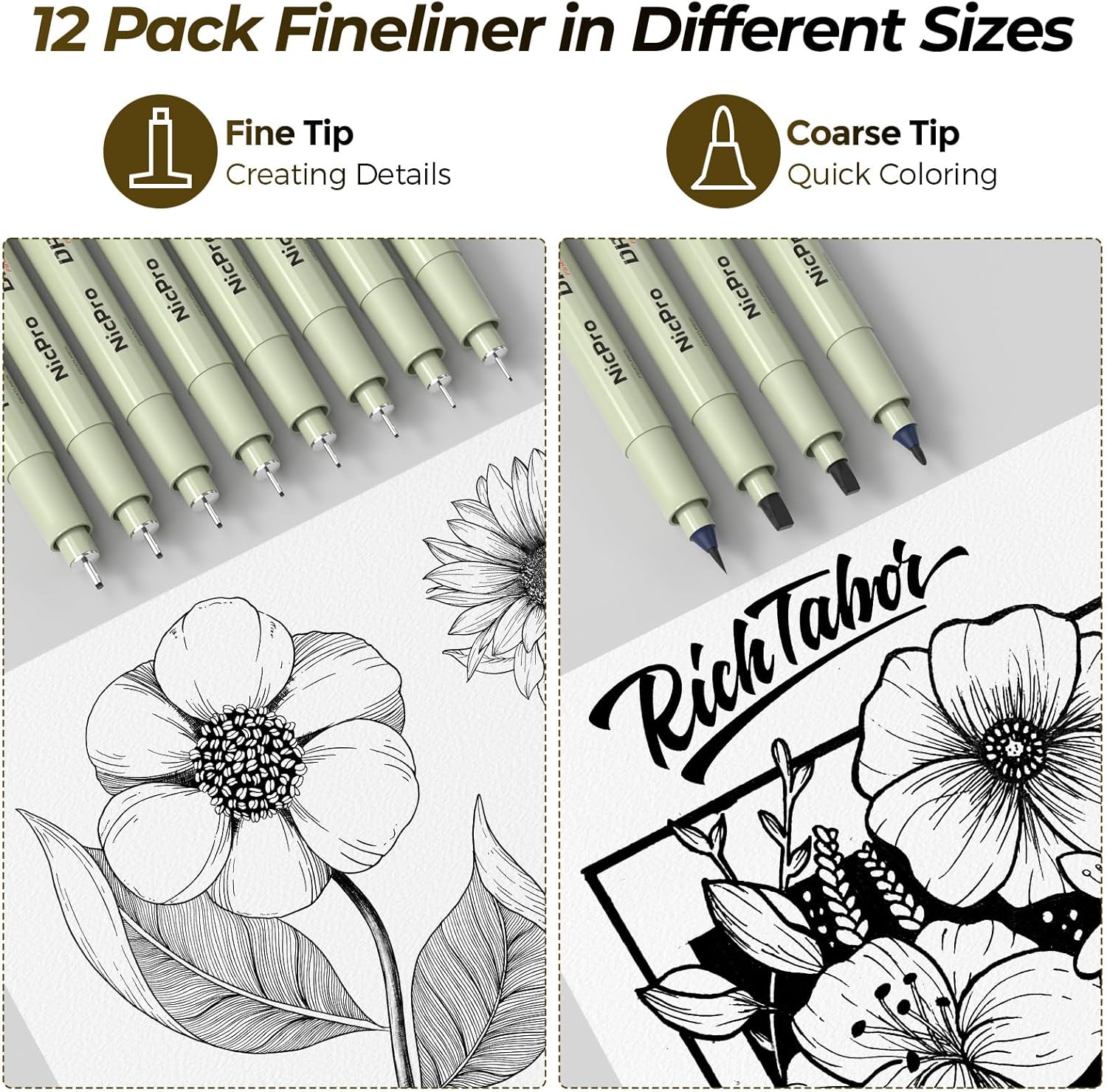 - 12 Black Micron Drawing Pens: The drawing pen set contains 12pcs assorted types of micro pens, Line width & cap size: 0.2mm (005), 0.25mm (01), 0.3mm (02), 0.35mm (03), 0.40mm (04), 0.45mm (05), 0.50mm (08), 0.55mm (1.0), 1.0mm (1), 2.0mm (2), 3.0mm (3), Brush (BR). No Bleed, No Smear and Waterproof. Perfect for artists and designers drawing, writing. Whether you are an artist or a beginner, you can easily use it