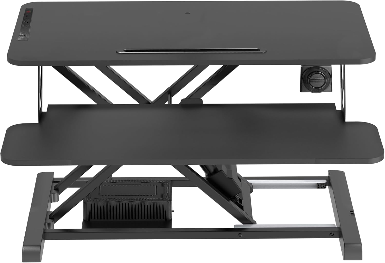 - Large electric stand up desk workstation - 37.4"x15.75" desktop work surface can hold two monitors up to 31"; 31.8"x11.8" keyboard tray can also hold a laptop, plus your mouse while keeping arms in an ergonomic position.