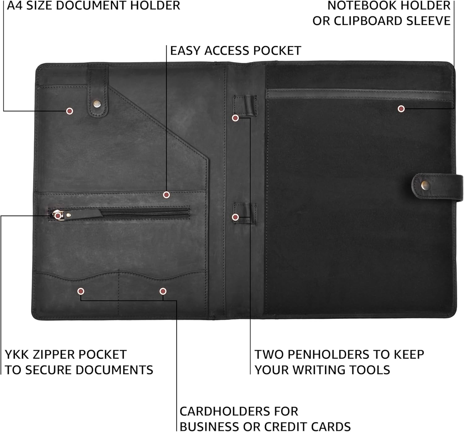 - Confident Impressions: Perfect for meetings, presentations, or interviews, this padfolio provides easy access to your paperwork without the hassle of zippers. Its 13" x 10" size offers ample storage for letter sized and A4 notepads, along with 2 business card holders pockets and 2 pen loops for added convenience. It also features a YKK zipper pocket for secure storage.