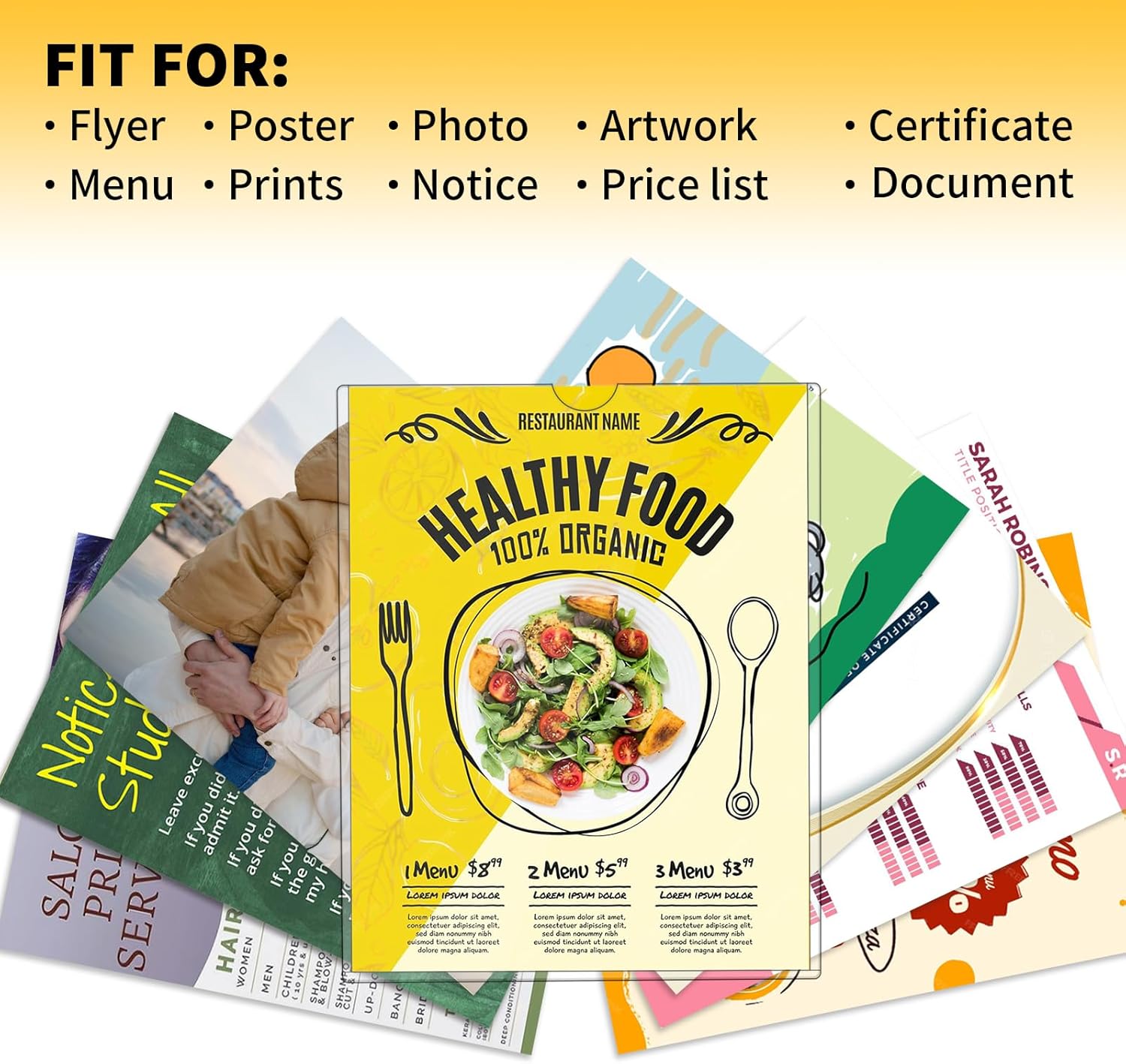 - MULTIPURPOSE USE - Double-sided visibility, horizontally and vertically displayed, top loading design,the display frame is suitable for displaying documents,poster,menus,autographed photos, prints,art paintings,announcements, info, price sheets, reminder signs,advertising leaflets, forms
