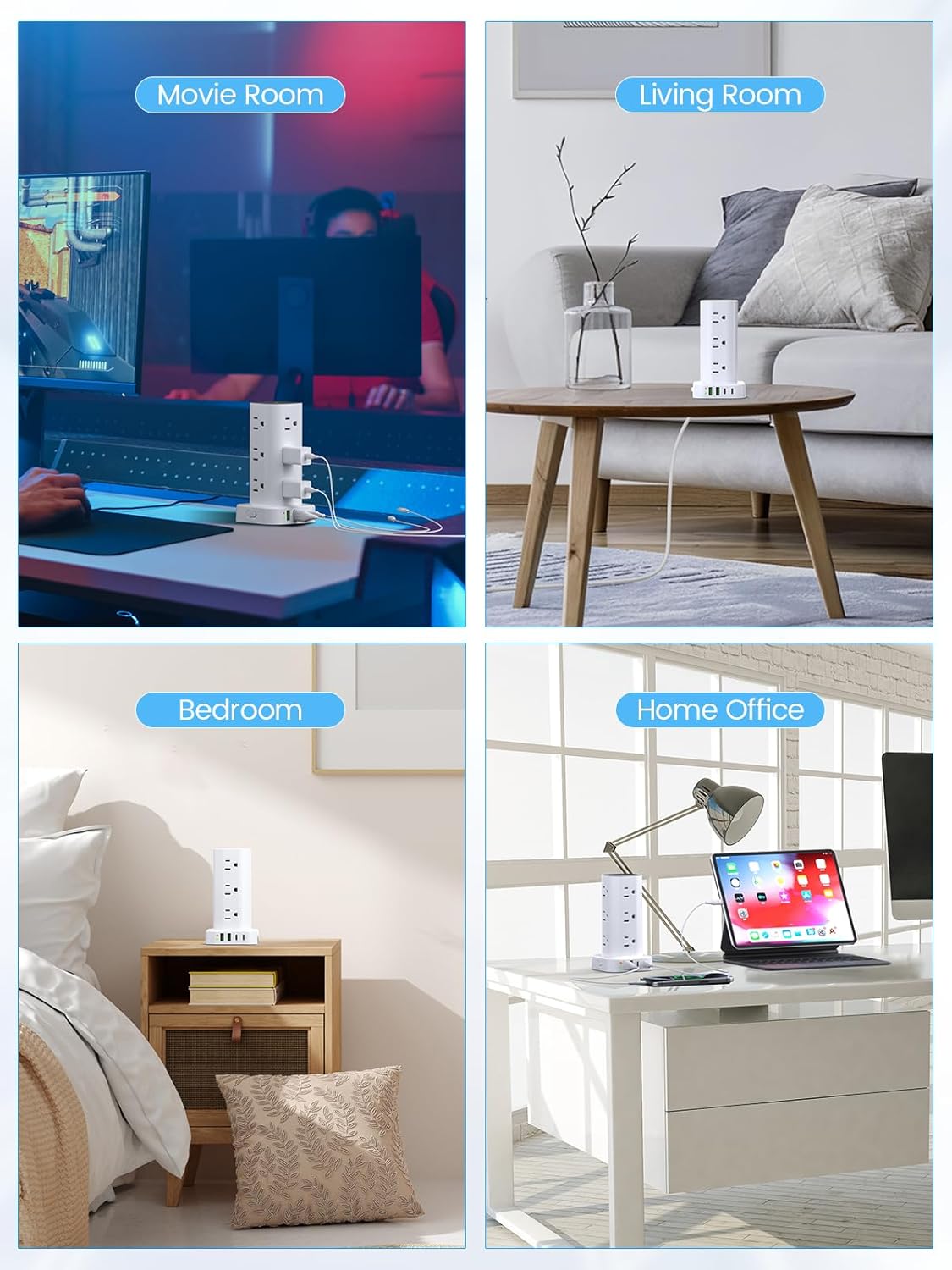 - 【Compact and Organized Space Solution】The all-in-one multifunctional charging tower occupies minimal vertical space, helping to keep your home or office organized and clutter-free. With 4 rubber feet at the bottom, it efficiently keeps the 6 ft extension cord from slipping and sliding.