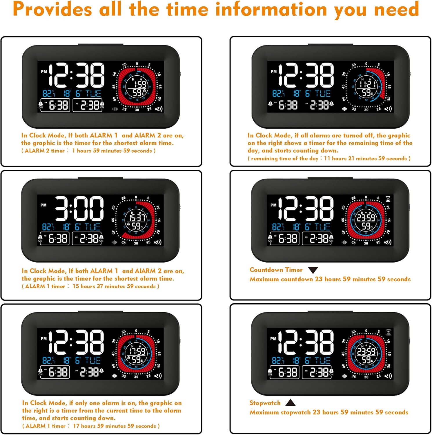 - Time management station: Our multifunctional dual alarm clock provides all the time information you need with just one screen, for bedrooms cooking baking learning fitness and in the office. It features a built-in timer temperature date week display, supports 12/24 hour format with dual alarm settings. The snooze function lets you simply tap the button [ SNOOZE LIGHT ] to stop the alarm, and it will automatically sound again after 9 minutes later.
