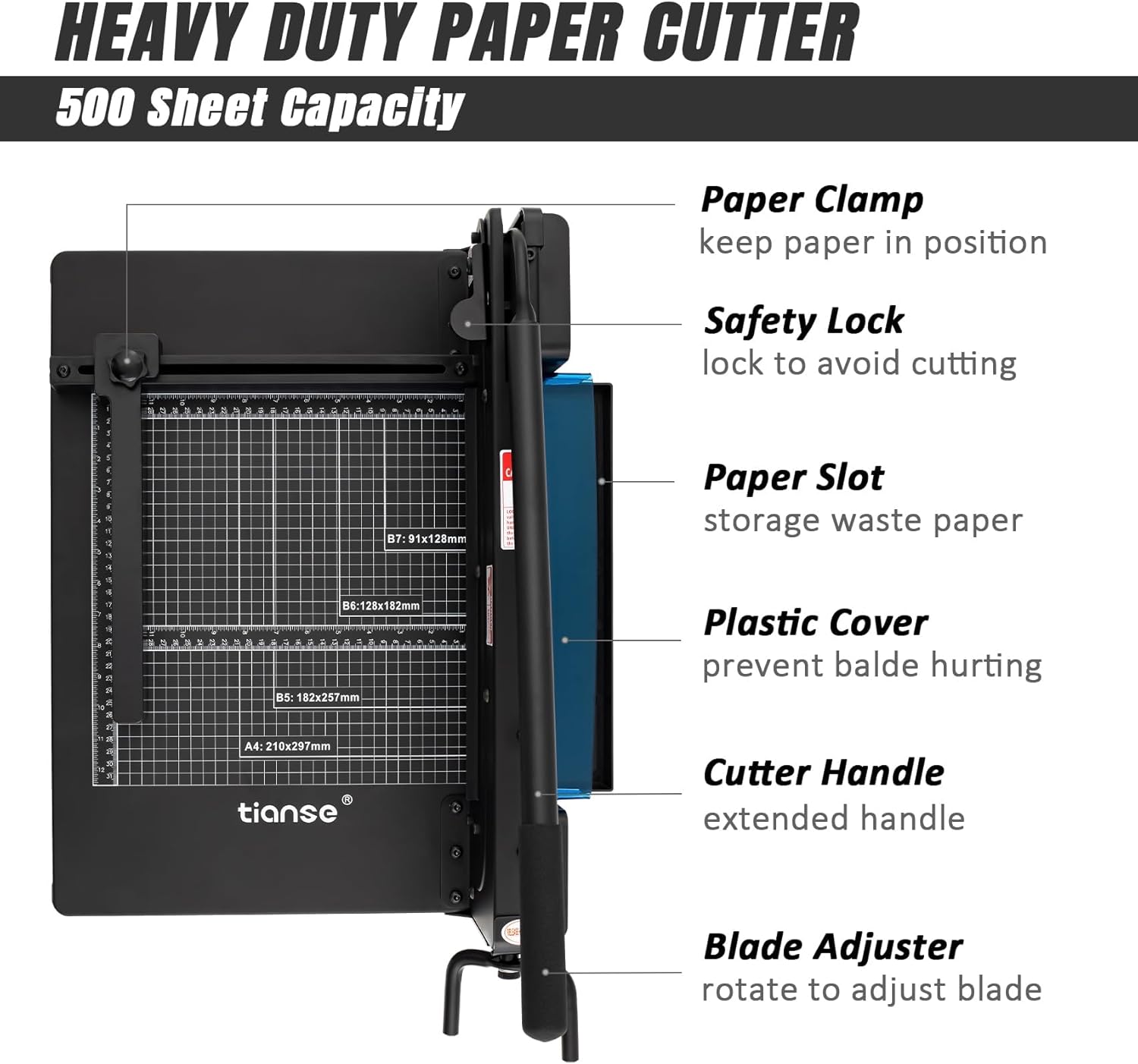 - 500 Sheet High Capacity : With texting the heavy duty paper cutter maximum cutting capacity : 500 Sheets 2.5 oz A4 Paper about 1.57 inch thick; Adjustable pressure clamps for balanced stress on paper that avoids paper moving when cutting multiple sheets