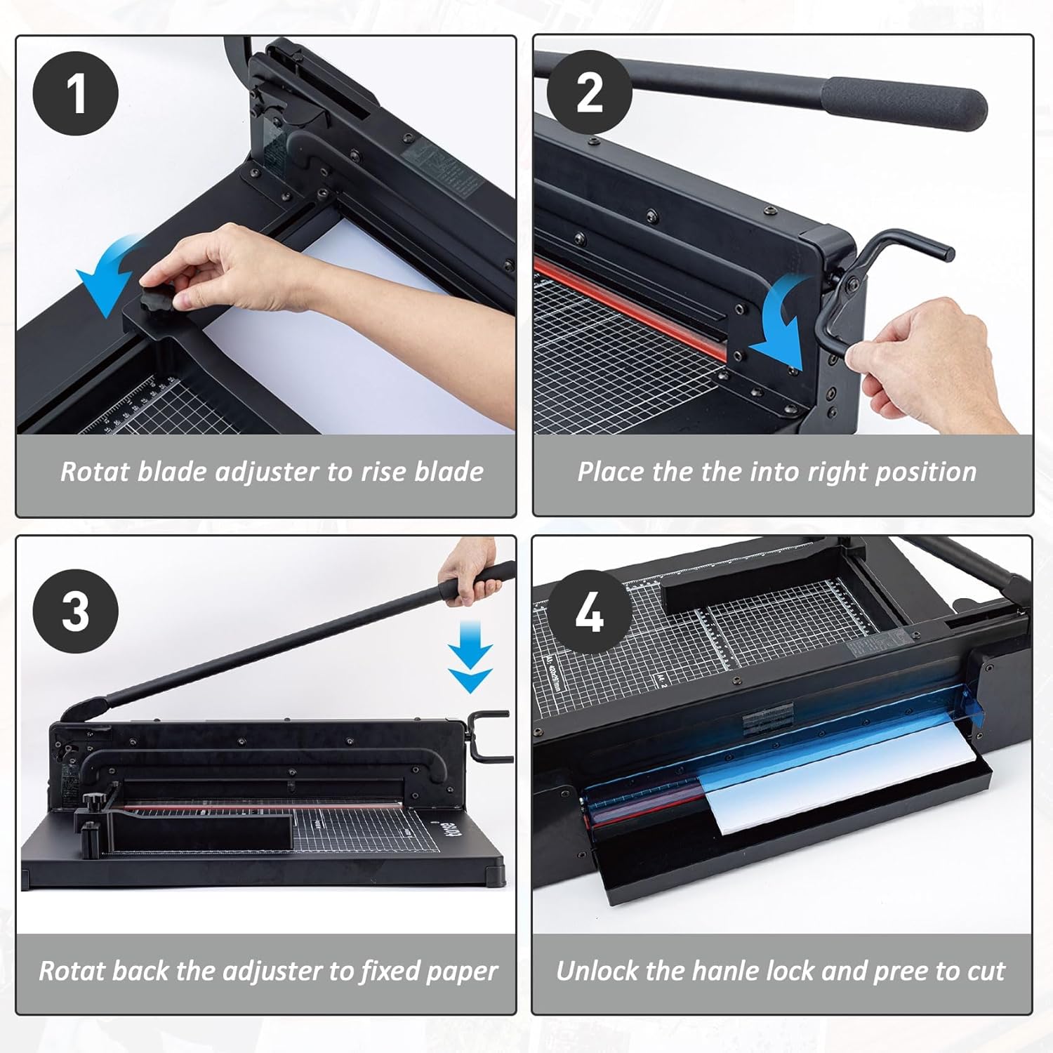 - Safety Lock Design : The security lock on the paper cutter heavy duty is lock to anti handle and blade cut down when placing paper; For safety we have posted a warning message on the paper cutter; please pay attention to the warning message when using it